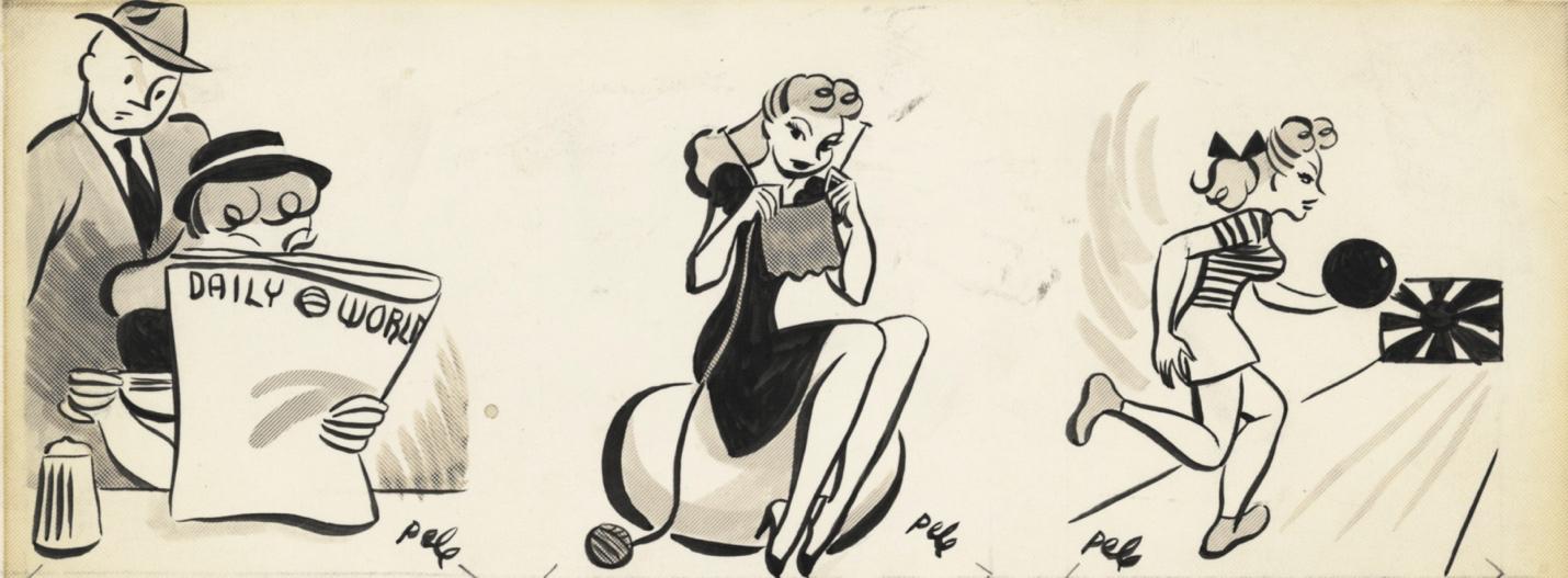 In her self-published autobiography, Pele: A Passionate Journey Through Art and the Red Press, de Lappe wrote, “Mike Quinn, author of the definitive account of the ’34 strike, The Big Strike, had a regular column in the [People’s World]. …He was the ‘father’ of my little creation, Vicky Says, a daily single column-sized cartoon. Vicky (for ‘victory’) was a leggy female who, with limericks, exhorted readers to speed the war effort. …My FBI files noted duly noted that ‘Vicky’ was one of my subversive activities on the PW.”