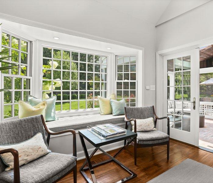 Each room exudes an abundance of natural light and features rich dark hardwood floors, lofty 9-foot ceilings on the first and second floors, updated windows and doors, beautiful moldings and built-ins, and modern lighting and custom window treatments. The gourmet kitchen has been meticulously modernized, boasting custom cabinetry, a generous center island, high-end appliances, a pantry, granite and wood countertops, and a captivating floor to ceiling fieldstone fireplace, and a vaulted ceiling accented by rustic beams and a charming barn door.