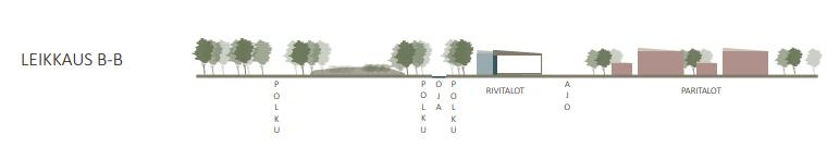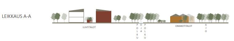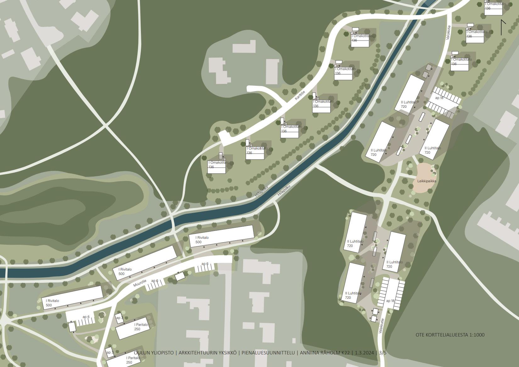 Asutus on matalapiirteistä ja asettuu lomittain ojan uomaa mukaillen. Asuinrakennusten virtaava liike mahdollistaa virtaviivaiset näkymät luontoon. Tonteille ajetaan aluetta ympäröivän jo olemassa olevan tieverkon kautta. Tonttikadut kurottavat korttelialueiden alkuun, josta kulku tapahtuu kivetettyä kevyelle liikenteelle tarkoitettua väylää sekä polkuja pitkin.