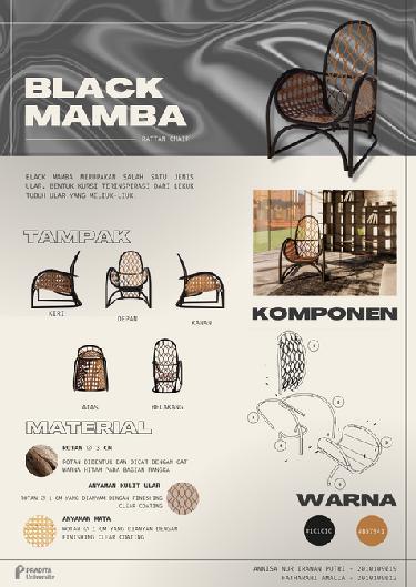 Black mamba is a type of snake The shape of the chair is inspired by the snake's twisting curves. This chair was made for Chair Design subject The main material is nature rattan This chair is one of a final outcome of the collaboration between Satori Rattan factory and students Black mamba was showed up on IFEX 2023 at JiExpo Jakarta on 9-12 March 2023