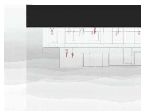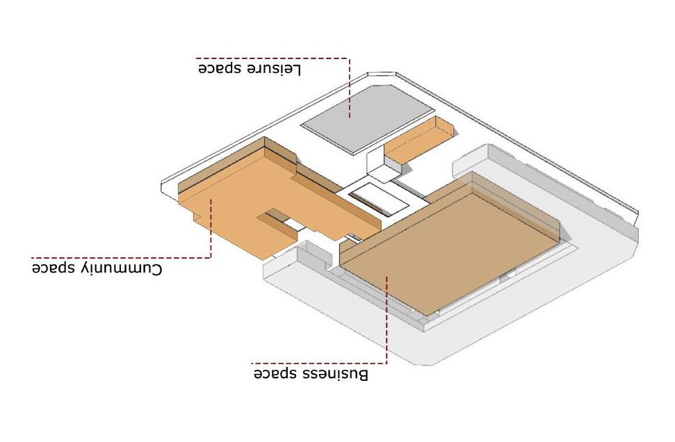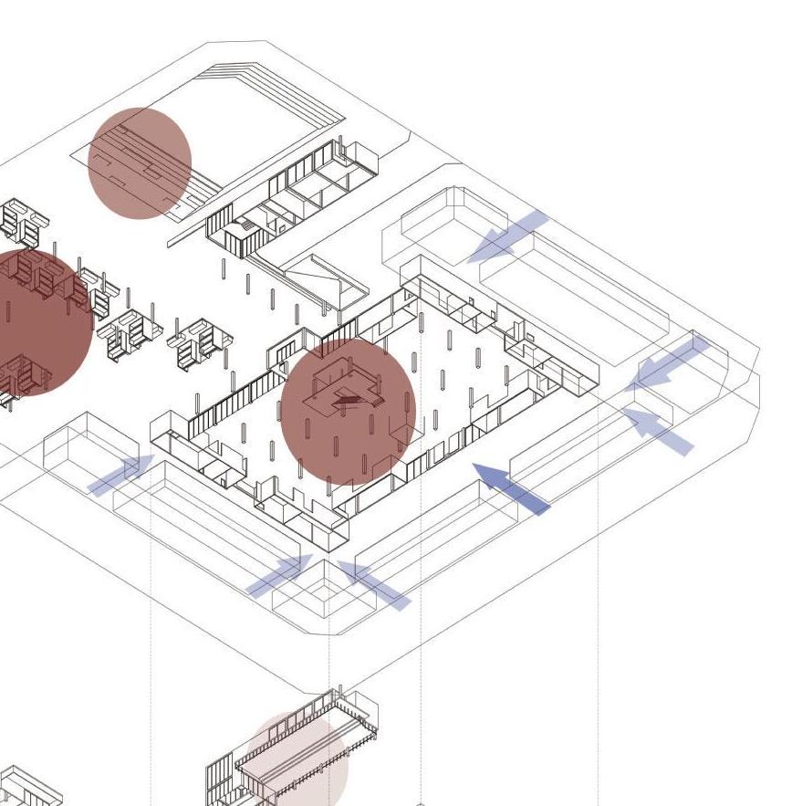 I made the circulation more systematically. Put a mainway in the middle of this building, the circulation will be scattered from the main way to the other spaces. The atrium vertical line there not only adjusted the air and atmosphere but also became a mark. As long as people look up, they can know their approximate position and not easily get lost. Below the stairs, I also placed an area for people to rest or wait for their friends. In addition, it will be a good view from here to see this lively market.