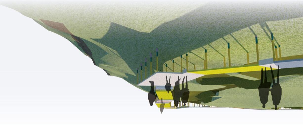Under the existing inverted umbrella structures, crowds slowly gather at each node, and finally, people walk onto the embankment without noticing the elevation changes. We try to break the faults in the city, the inverted umbrella structures, and the embankment. In addition, creating a dialogue between people, umbrellas, and the riverbank. -