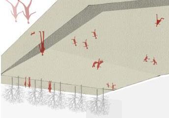 Place arc walls and water into those spaces of inverted umbrella-structure areas, enhancing an entertaining atmosphere, the possibility of stopping by, and exploratory.