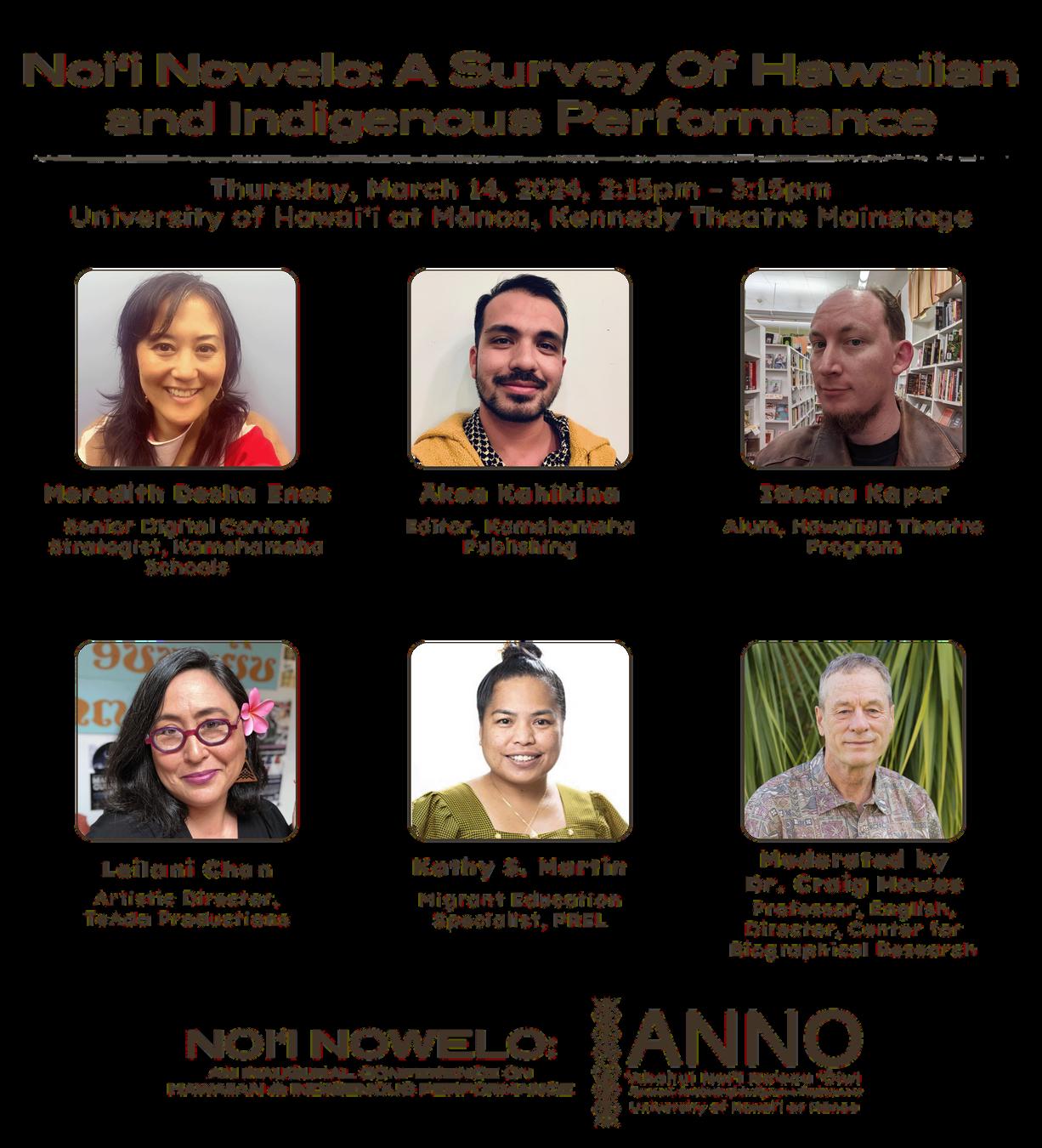 The Archive & Curriculum Maʻawe works with institute members to host professional development workshops on teaching pedagogy, develop curriculum modules on Indigenous arts practices for university instruction, and a hana keaka (Hawaiian-medium theatre) curriculum in partnership with the Office of Hawaiian Education of the Department of Education. As part of the archival aspect, recordings of panels and other materials from the conference will be housed on ANNO’s website for worldwide access to serve our global community. This Maʻawe also provides support to the Hawaiian Theatre MFA Program, as well as the new PhD in Hawaiian and Indigenous Performance.