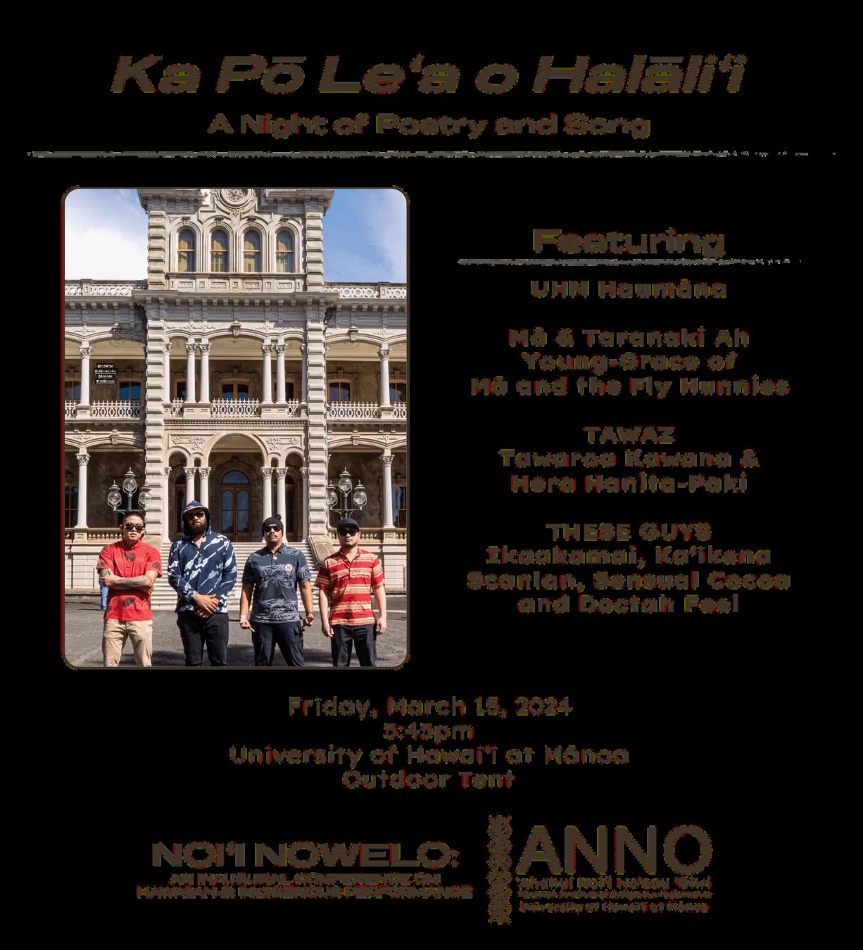 The night begins with a poetry readings and is followed by new compositions from students from the University of Hawai‘i at Mānoa as seen in the first iteration of this event. These new compositions were developed under the mentorship of Tawaroa Kawana, Hera Hanita-Paki, Mā, and Taranaki Ah Young-Grace. Later, we are again treated to a special performance Waiata Māori, brought by Mā & Taranaki of Mā and the Fly Hunnies. Finally, the night is culminates with original Hawaiian band These Guys, featuring Ikaakamai, Ka‘ikena Scanlan, Sensual Cocoa and Doctah Feel.
