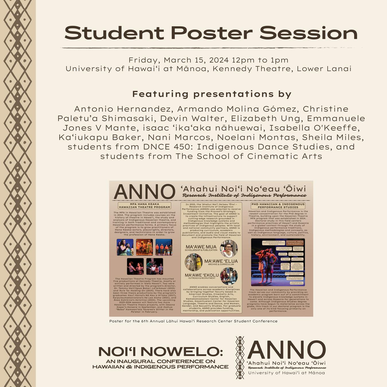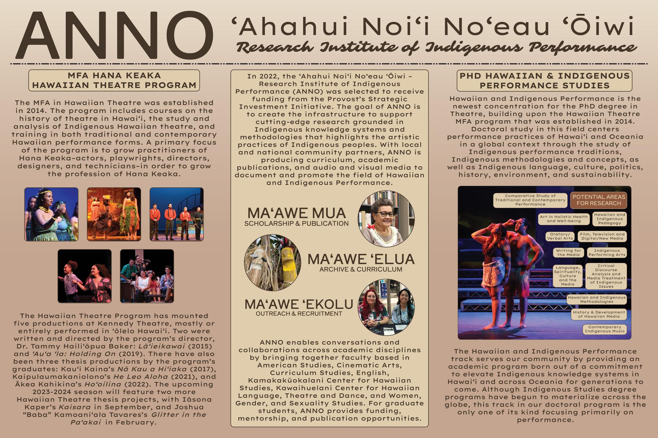 “Ka lamakū o ke aloha ʻāina: A leading light of aloha ʻāina for Hawaiʻi and the world.”ʻO ka ʻAhahui Noiʻi Noʻeau ʻŌiwi -Research Institute of Indigenous Performance (ANNO) ʻo ia ka hui ʻimi noiʻi mua loa i hoʻokumu ʻia i kahua paʻa mau loa no ka ʻimi ʻana, ka hoʻoulu ʻana, a me ka mālama ʻana i ka ʻike i pili i ka hana noʻeau Hawaiʻi a ʻōiwi kekahi; e like hoʻi me nā mea o ke au kuʻuna mai – ka hula ʻana, ka haku mele ʻana, ke kālai ʻana, a pēlā aku – a me ko lākou ala hou ʻana i ke au nei, ma ka hana keaka paha, ma ka haku poema paha, a ma nā ʻano mea like ʻole hoʻi. Hoʻākoakoa ʻia nō hoʻi nā kumu kulanui o nā ʻoihana like ʻole, ʻo American Studies ʻoe, ʻo Cinematic Arts ʻoe, ʻo Curriculum Studies ʻoe, ʻo English ʻoe, Kamakakūokalani Center for Hawaiian Studies ʻoe, ʻo Kawaihuelani Center for Hawaiian Language ʻoe, ʻo Theatre and Dance ʻoe, ʻo Women, Gender, and Sexuality Studies ʻoe, a me nā mahele ʻike he nui wale. Pēlā hoʻi e hāmama a e māpuna aʻe ai ke kamaʻilio aku, kamaʻilio mai a me ke kākoʻo aku, kākoʻo mai o nā māhele ʻike like ʻole kekahi i kekahi. Hoʻolako ʻia hoʻi kēia papahana e ka Strategic Investment Initiative a ka Provost o ke Kulanui o Hawaiʻi ma Mānoa.