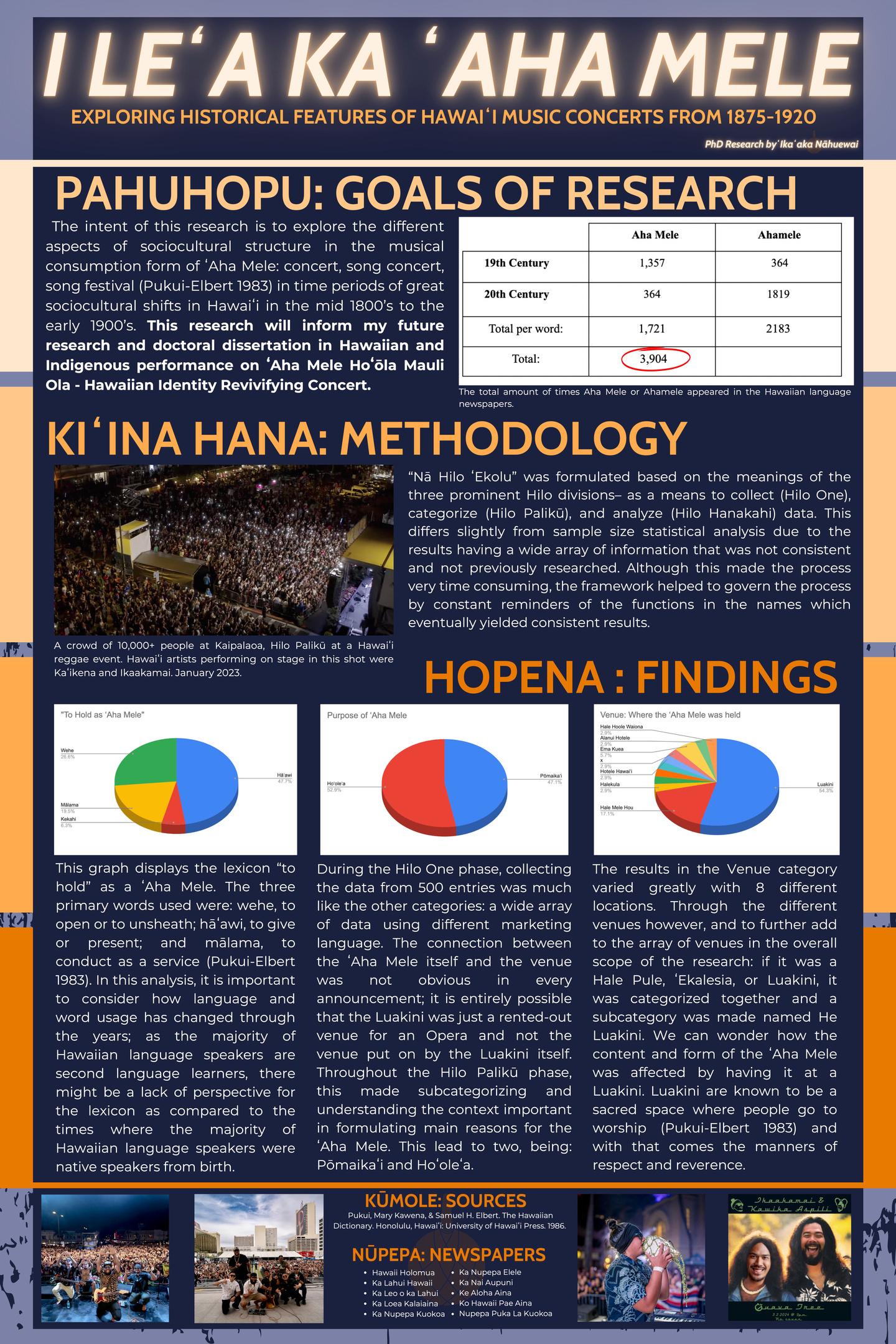 Mai ka hola 12:00pm a i ka hola 1:00pm, kono ʻia nā mea a pau e uhaele mai i kekahi hanana i māama ʻia i wā no ka hōʻikeʻike ʻana i ka ʻimi noiʻi, i wā hoʻi no ka poʻe haumana o ka Hana Keaka, ka Hulahula, a me ka Hana Noʻeau e hoʻopahola mai i kā lākou papahana e ʻimi noiʻi ʻia ana. ʻOiai, ʻaʻole nō e lōʻihi aku, e lilo auaneʻi lākou ʻo nā alakaʻi o kēia hana, eia kahi wā e launa pū ai me nā haumāna
