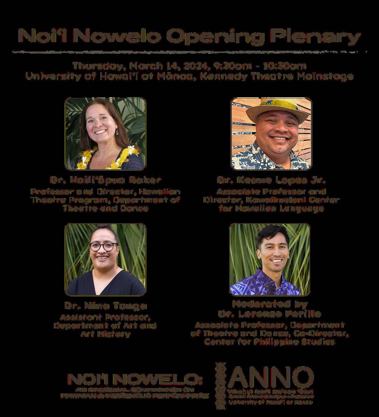 On behalf of the faculty, staff, and students of the University of Hawai‘i at Mānoa, I would like to extend a warm welcome to Noi‘i Nowelo! Supported by funding from the Mānoa Strategic Investment Initiative, the ʻAhahui Noiʻi Noʻeau ʻŌiwi – Research Institute of Indigenous Performance (ANNO) was founded in 2022 with the goal of stimulating scholarship in Hawai‘i and the global Indigenous community that highlights the artistic practices of aboriginal peoples. This inaugural conference is an outcome of an exciting collaboration among our scholars from across campus, in American Studies, Cinematic Arts, Curriculum Studies, English, Kamakakūokalani Center for Hawaiian Studies, Kawaihuelani Center for Hawaiian Language, Theatre and Dance, and Women, Gender, and Sexuality Studies.