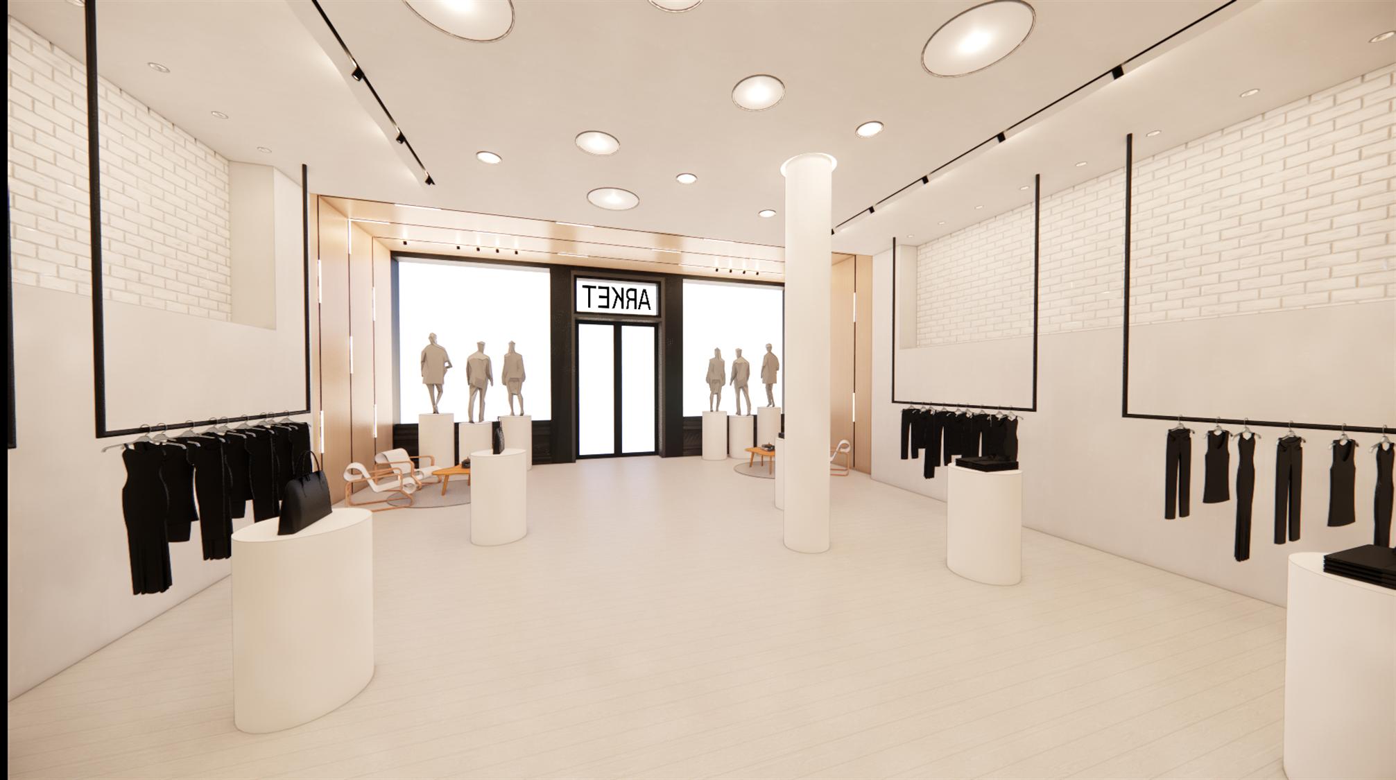 Playing off the idea of a sheet of paper, the design creates a blank slate through a neutral palette of light wood, whitewashed brick, and shikkui plaster walls punctuated by black accents. This design creates a understadedly elegant backdrop which emphasizes the products themselves and is sure to complement every upcoming collection. The Scandinavian heritage of the brand is also celebrated through the use of iconic Scandinavian furniture and decorative lighting. AutoCAD, Revit, Enscape, Photoshop