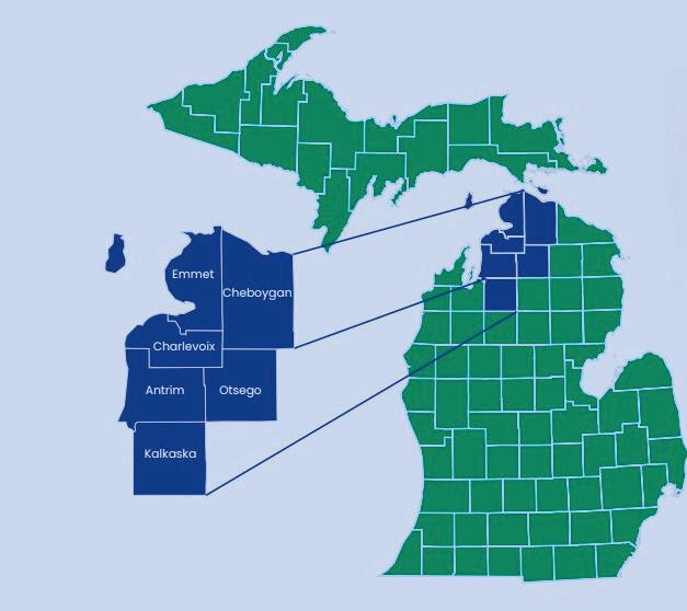 North Country Community Mental Health serves the six counties shown in dark blue on the map.