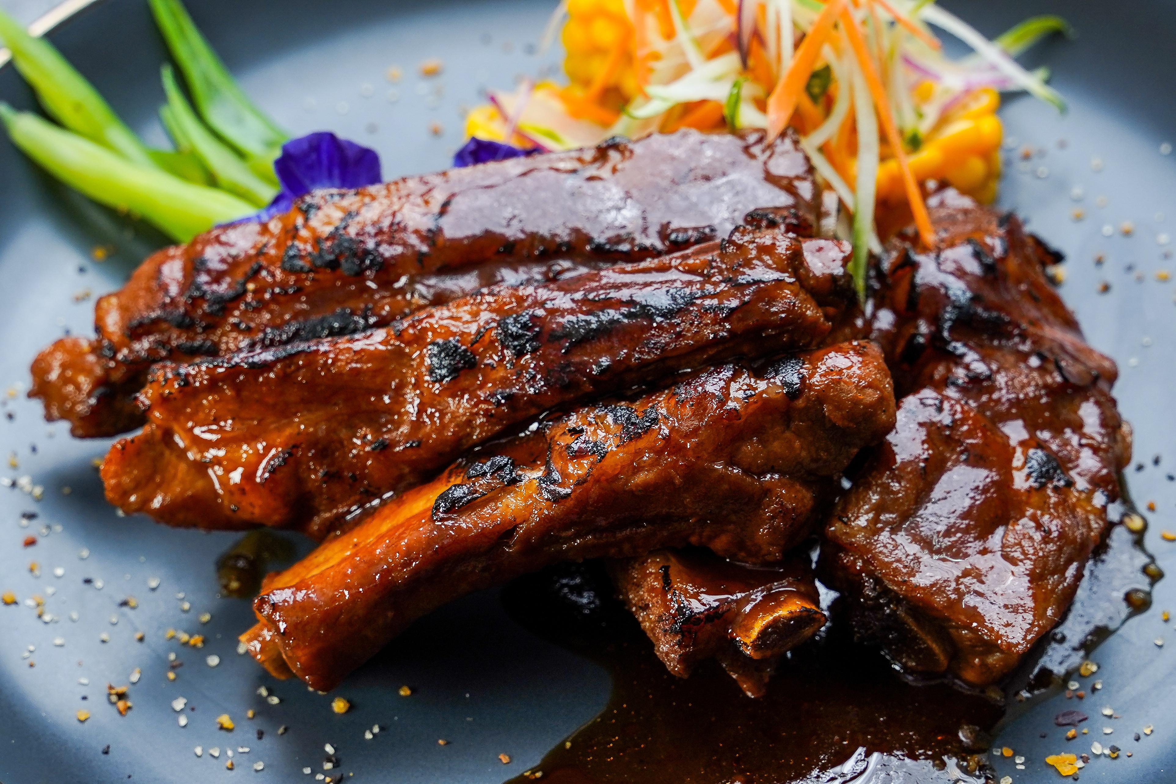 BITE SIZE BBQ SPICED RACK OF PORK RIBS, SMOTHERED WITH BBQ SAUCE AND ROASTED
