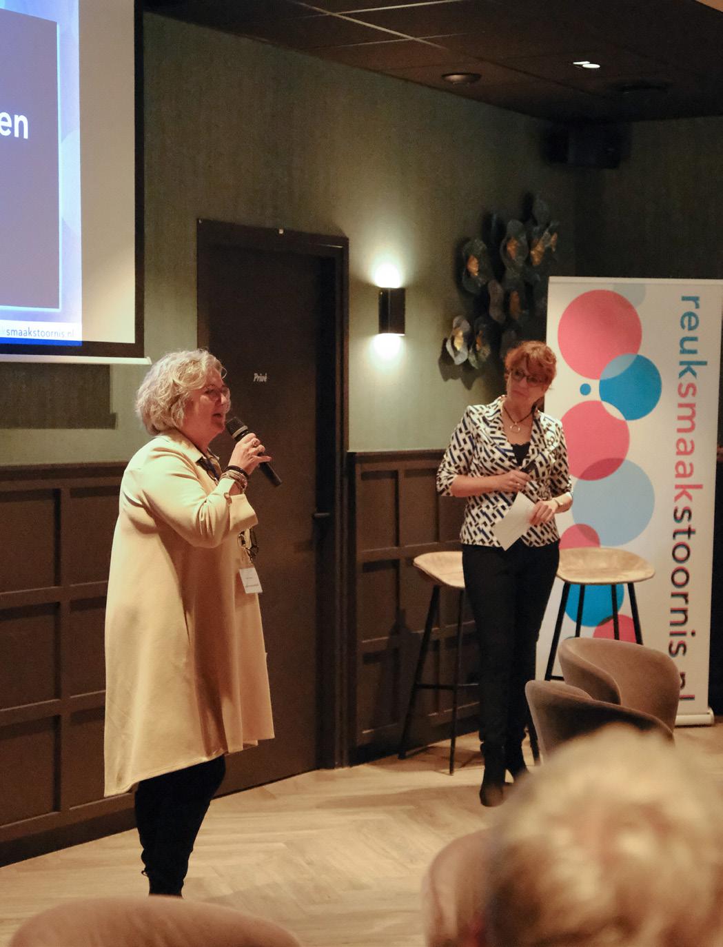 Jasper de Groot presenteerde ‘De chemie tussen ons’: hij vertelde over zijn onderzoek naar de geur van angst bij mensen. Het ver spreiden van geuren is een belangrijke manier van communicatie bij mensen, een die heel erg onderschat wordt. Hij presenteerde de eerste resultaten van een klein onderzoek onder onze leden naar de impact van reukstoornissen op hun mentale welzijn. Vra gen zoals: heeft het gemis van de geur van de partner invloed op de behoefte aan seks, mist men het sociale aspect van gezamen lijk eten en het genieten van een maaltijd, en welke geur mis je het meest, kwamen voorbij. Erg interessant is dat hij in zijn komende onderzoek ook wil kijken naar mensen met anosmie: kunnen zij ook nog een geur van angst ‘detecteren’ en wat zegt dit over het reukorgaan? We zijn erg benieuwd naar de toekom stige resultaten!
