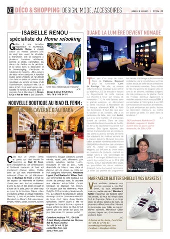 ous souhaitez redonner une seconde jeunesse à vos Stan Smith, ou tout simplement avoir un modèle unique ? Marrakech Glitter customise vos baskets selon vos envies, et vous les envoie dans tout le Royaume. Grâce à un large choix de strass, posés à la main, ce pionnier au Maroc vous offre l’élément indispensable pour briller en soirée ! Bonne nouvelle, Marrakech Glitter dispose, depuis peu, d’un showroom au Carré Eden. J.A. 4 Avenue de la Liberté, Carré Eden Tel : 05 24 37 90 54 marrakechglitter@gmail.com Facebook : Marrakech Glitter