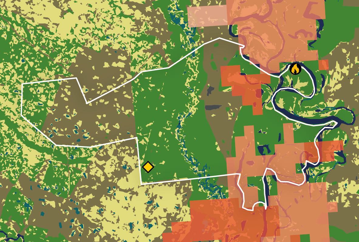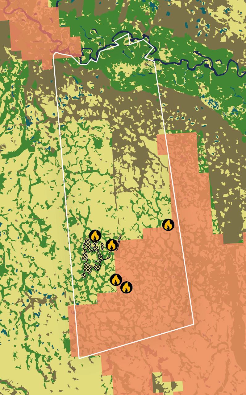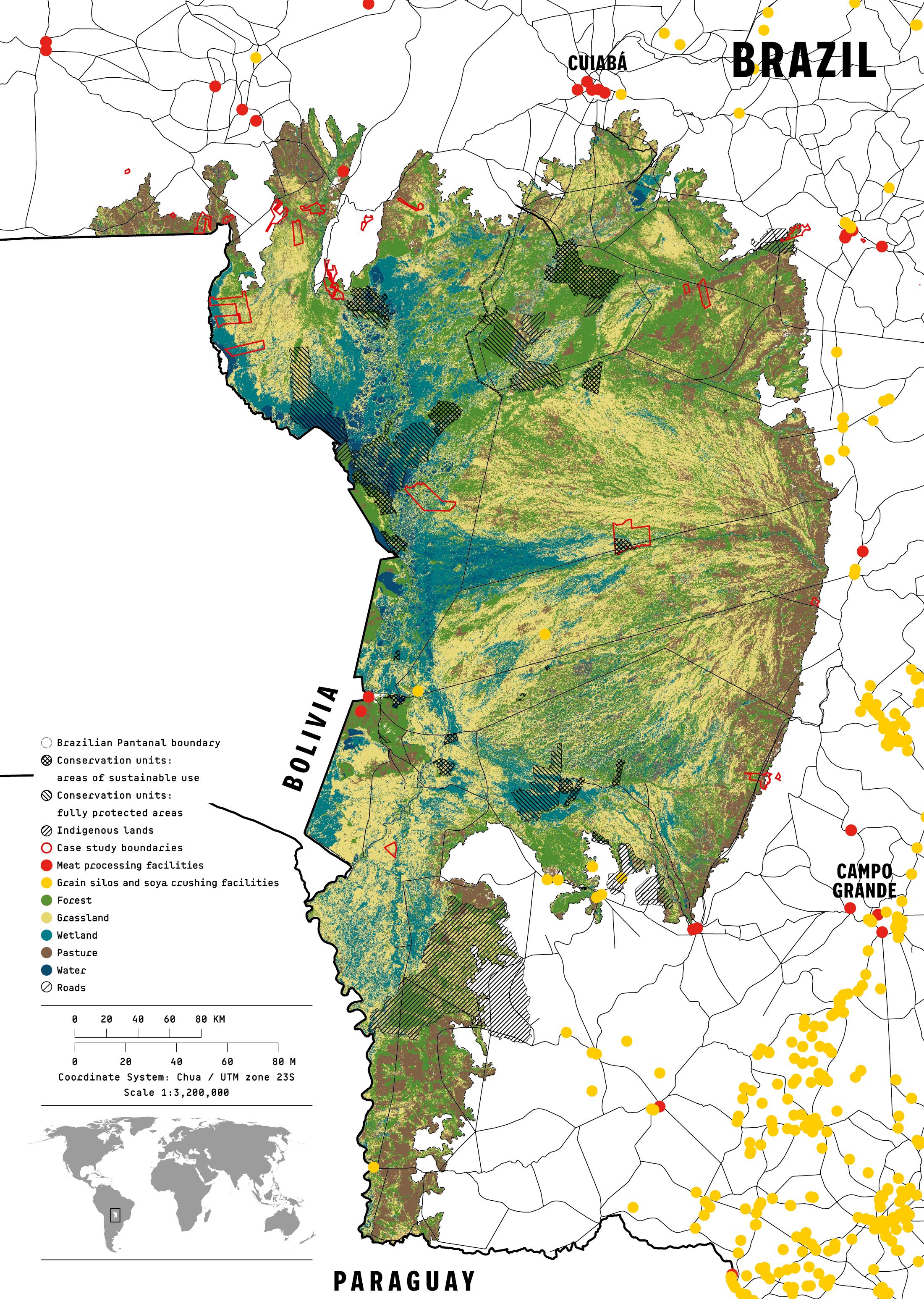 to lay claim to the land, putting it at increased risk of clearance for cattle ranching or soya farming. Ready access to soya and beef transportation and processing infrastructure facilitates use of the land by these sectors. Data from the Federal University of Goiás’s public Image Processing and Geoprocessing Laboratory (Laboratório de Processamento de Imagens e Geoprocessamento, Lapig) show that within the boundaries of the biome are four grain silos, with considerable presence of additional soya infrastructure and beef processing facilities within less than 100 km,104 including a number of facilities owned by JBS – the world’s largest meat processor105 – and its main competitors Marfrig and Minerva.