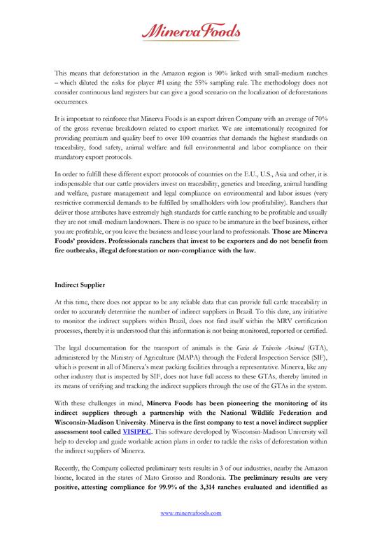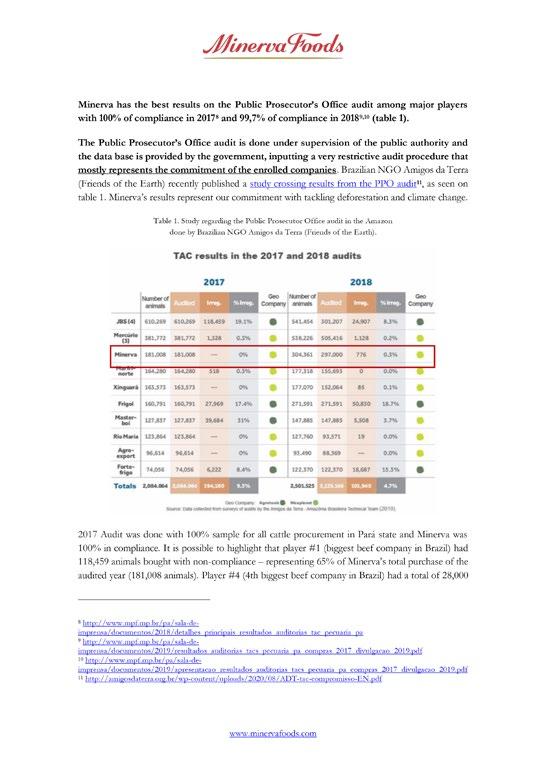 conflicts with that of Minerva in some instances.31 One of Marfrig’s historic trading relationships similarly appears to violate its sourcing policy,32 despite the company’s assertions about compliance. Marfrig has not indicated that it intends to review these trade relationships more closely.