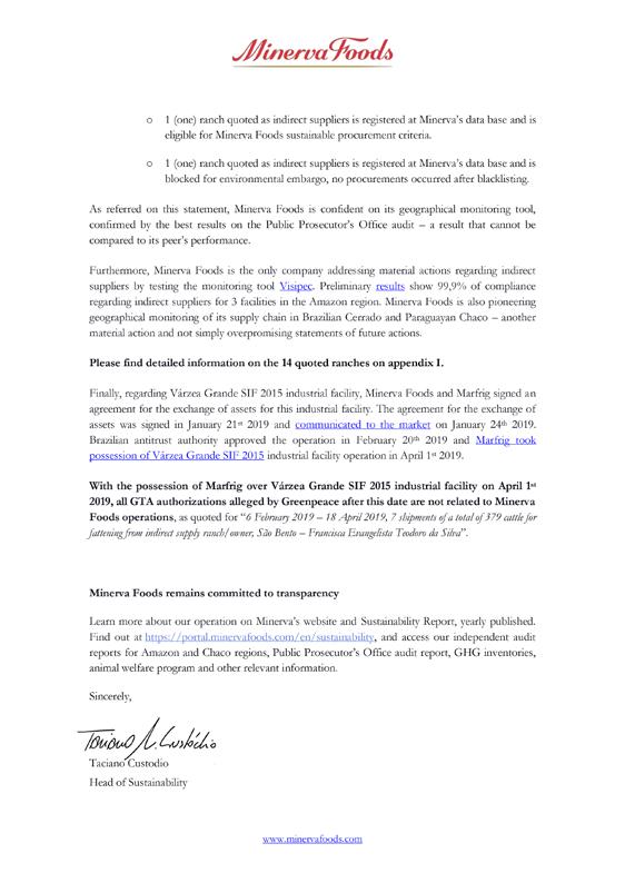 Minerva (2021) Sustainability statement (including an appendix review of Greenpeace evidence) from Taciano Custodio, Head of Sustainability – Minerva, 14 January 2014, full text available in Annex 2