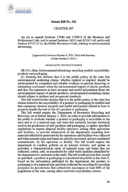 273 Specifically, California BPC § 17580(e) (State of California (2024)) states that “displaying a chasing arrows symbol or otherwise directing a consumer to recycle a consumer good shall not be considered misleading pursuant to . . . Section 42355.51 of the Public Resources Code. However, the requirements of BPC § 17580(a) still apply.”