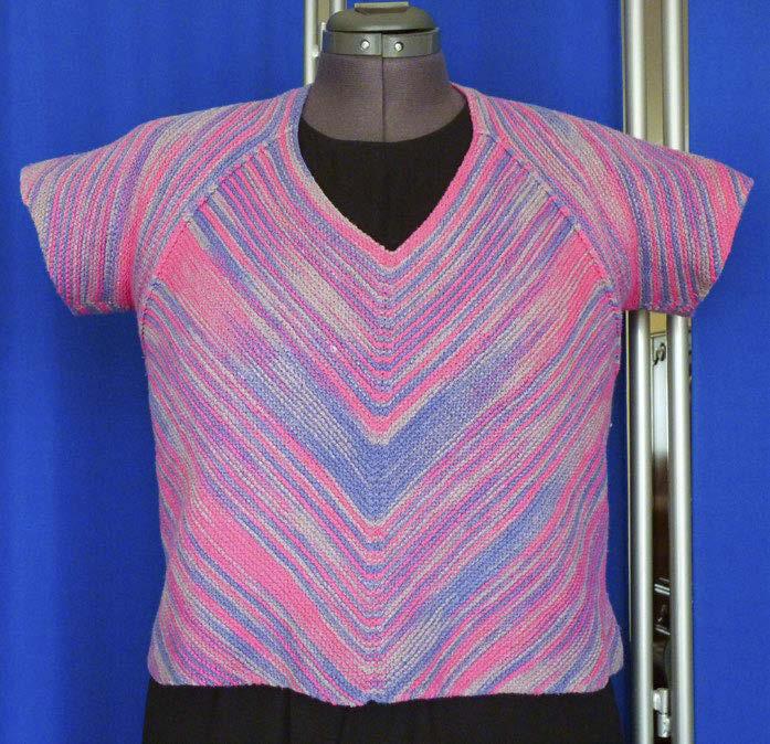 Many of my favorite knits have simple lines. Manon is a T-shirt made with a variegated yarn. Its unique construction method avoids pooling, because the stitch count changes almost every row. Any time pooling begins, it will change within a few rows as the stitch count changes.