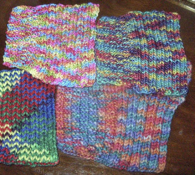 Vest Samples - These four samples were knitted for the Hummingbird Garden Vest. All were made with the same number of stitches with the same needles. The one on the bottom right was the one chosen for the vest. These pieces illustrate the importance of sampling when working with variegated yarns.