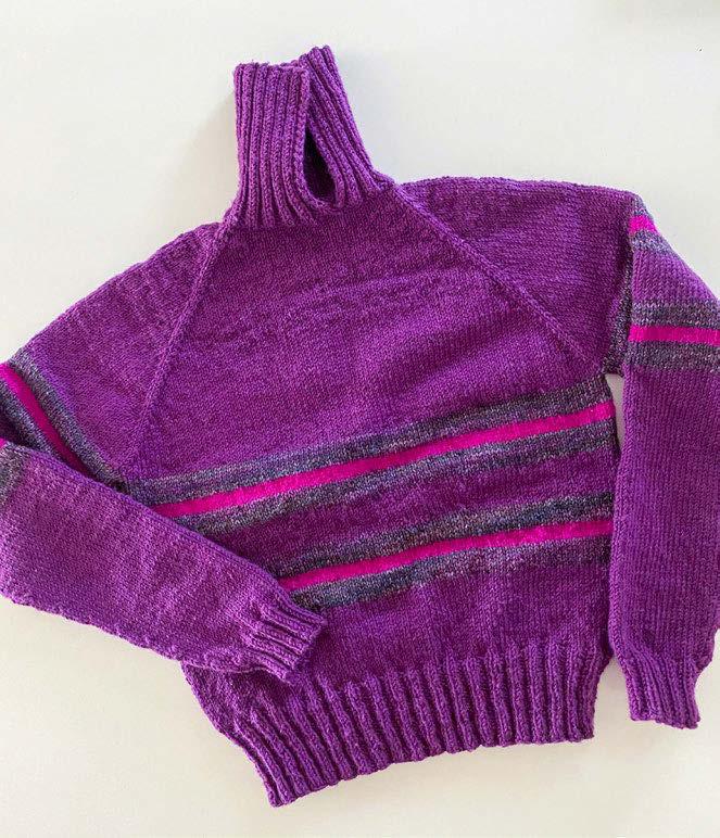 Shoot. That’s what I get for knitting late in the evenings. Here's where the fun begins. The pattern is both intriguing and experimental. I worked with the Pink Onyx by Ayako Monier, which I had previously knitted, and I added a collar, longer sleeves, and omitted the side faux cables. This time, I chose fewer stripes in similar purples, along with the hot purple yarn, to add some pop.