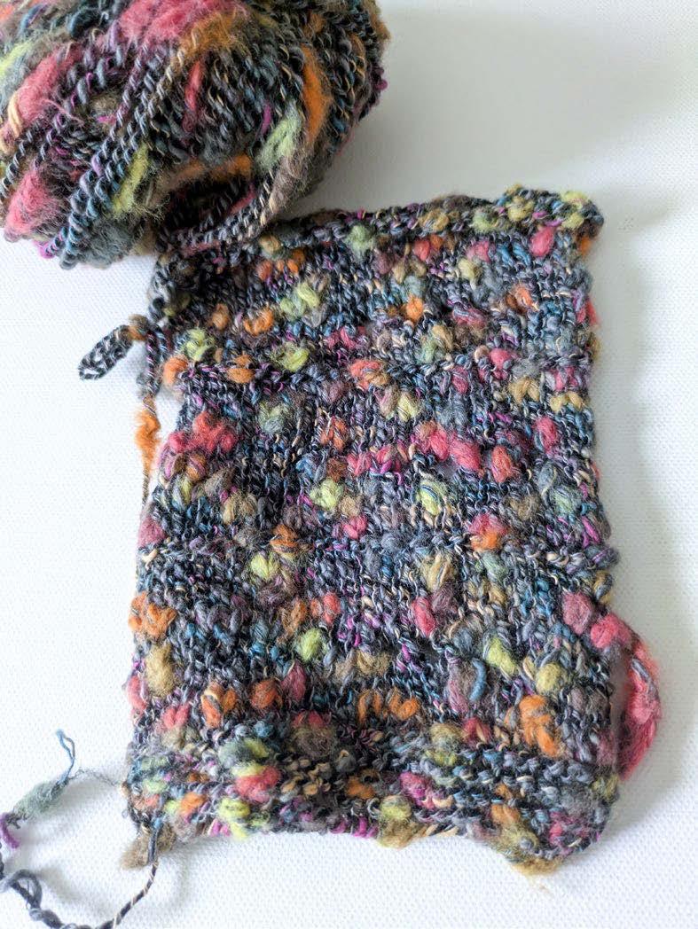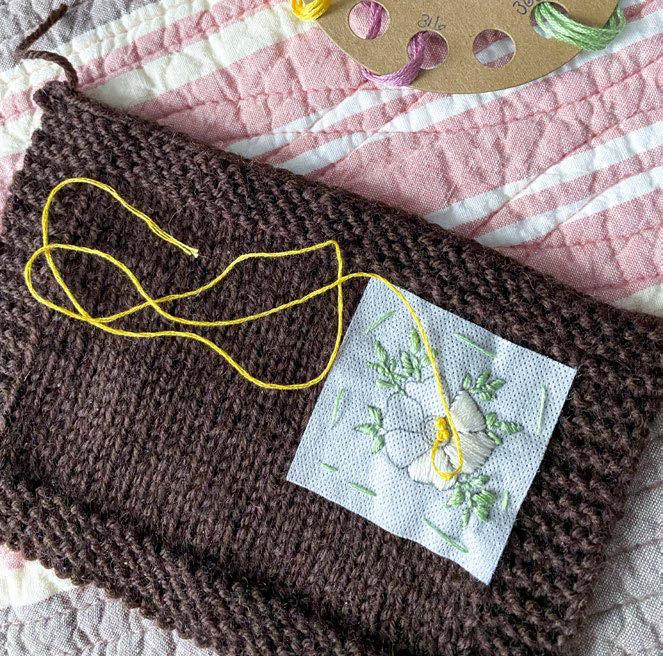 Around the same time I finished the pullover, it’s as if the universe said, “Oh, there’s more to explore and add to this experimental pullover, look here!” My local yarn store announced a class in their newsletter about embroidery on knits. As you might know, it’s not new; it’s been around for many decades. Since I already knew most embroidery stitches, my curiosity was more about how to embroider on a knitted surface than the stitches themselves. Every knitter knows you shouldn’t hoop a knitted garment, yikes! The class was exciting, and everyone focused on their embroidery for a couple of hours! My sample is on the left.