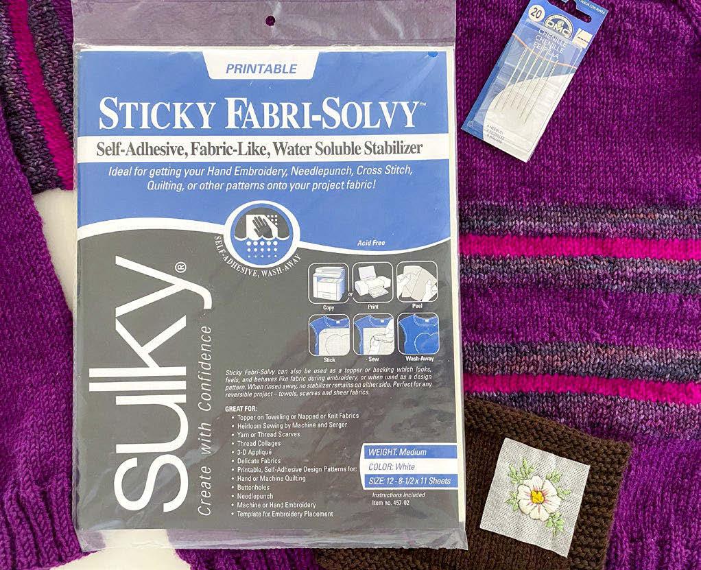 I used Sulky Sticky Fabri-Solvy, DMC floss, and DMC Chenille Needles Size 20. Sticky Fabri-Solvy adheres gently to a knitted fabric, but I also used a running stitch to secure the squares to the pullover. If you’ve never used it before, read all of the information written on the package. It’s easy to use and it’s printable. I drew my flowers on paper first to ensure I had the right flower, then I traced them onto the Sticky Fabri-Solvy.