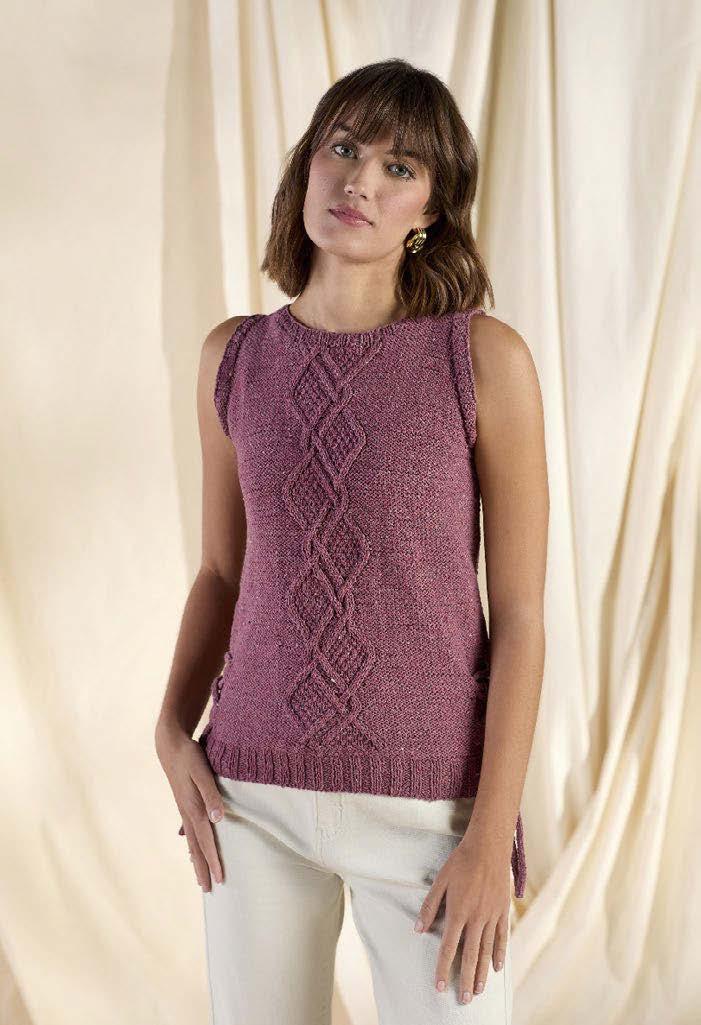 The straight lines of a drop-shoulder sweater are well-suited to variegated yarn because the body stitch count stays the same right up to the neck. They also suit complex patterns such as Nordic and Aran designs.