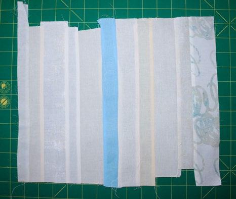 Sew one strip of your Group II fabrics randomly to the edge of each unit. The strip sizes of these 12 units will now vary from 6” to 7” x 22”.