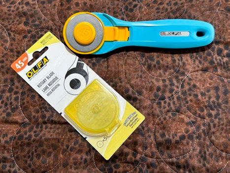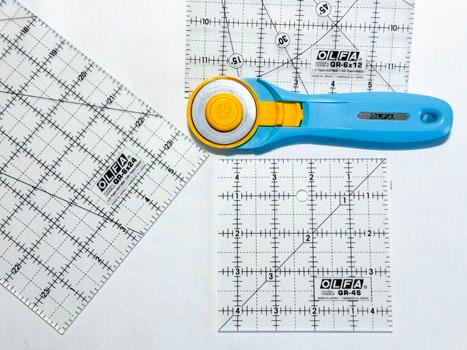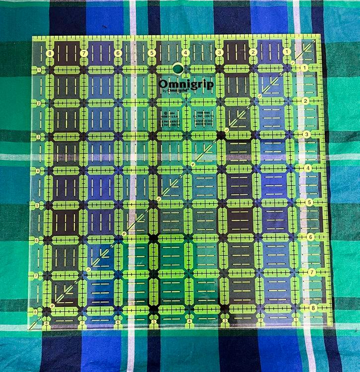 This ruler, designed for use with rotary cutters and straight-edge blades, has a right and left- hand numbering and angle system. The transparent, neon green double-sight lines seem to glow on both light and dark fabrics. The non-slip backing is a bonus. OLFA 45 mm Ergonomic Rotary Cutter (in the latest color –magenta)