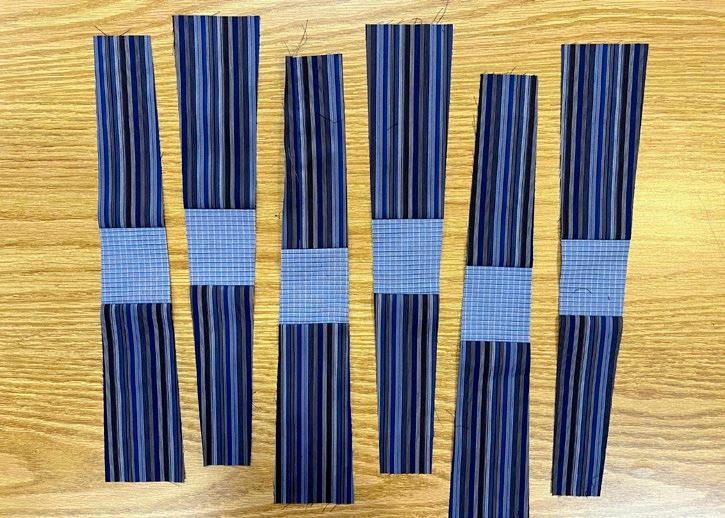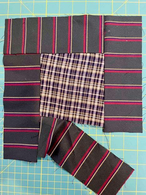 repurpose men’s shirts into quilted placemats working successfully with 1½”, 2”, 3” square fabric scraps