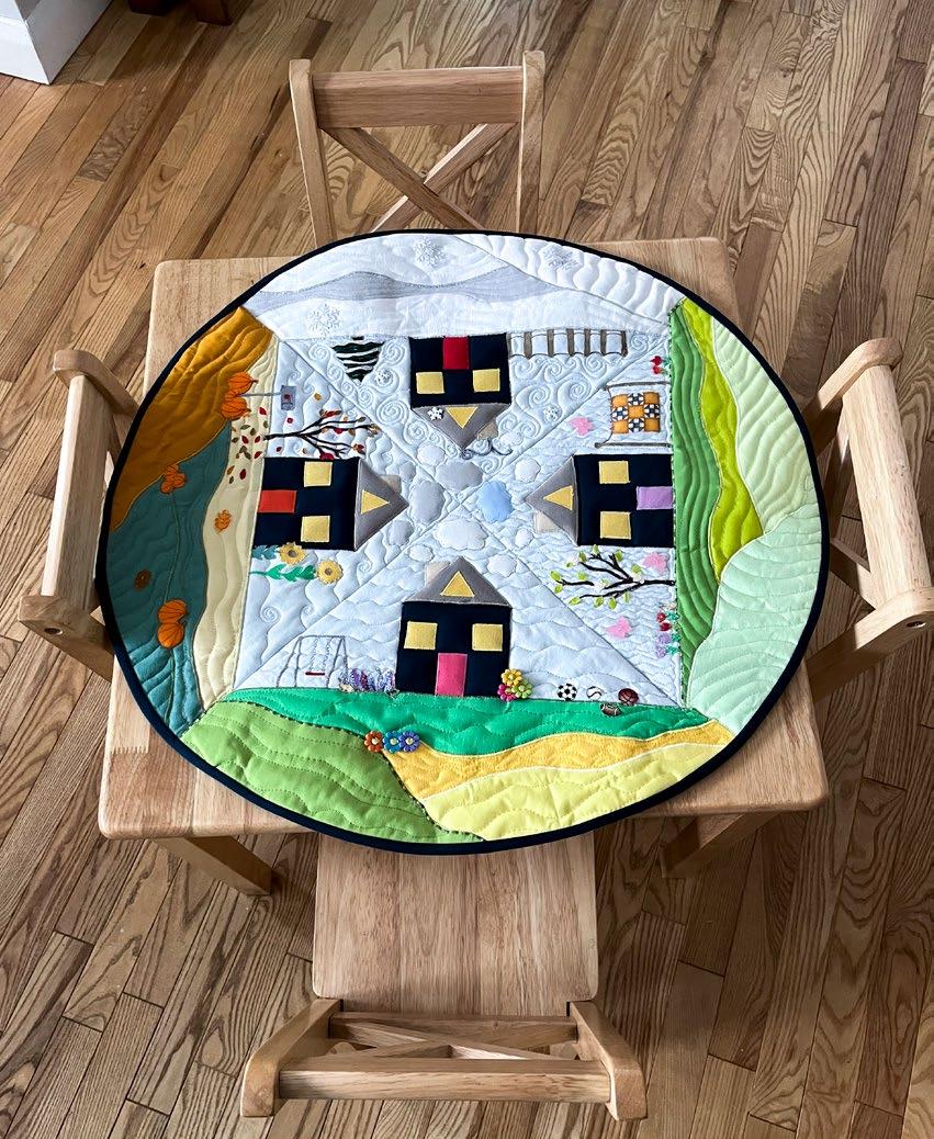 There is also an opportunity to make it your own from your stash of cotton fabric and embellishments to match your unique decor. Be sure to download the free Circle the Seasons Table Topper original
