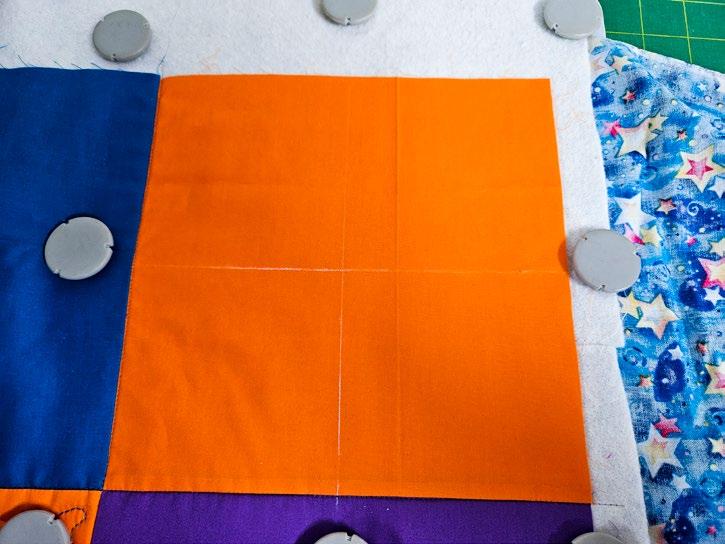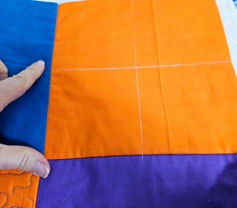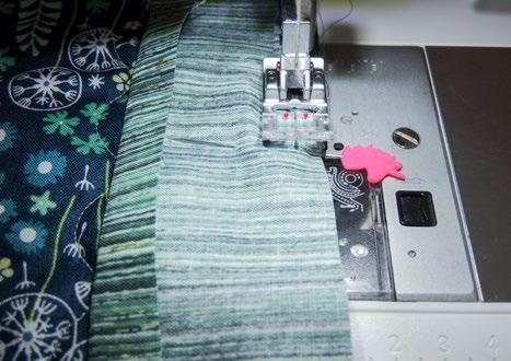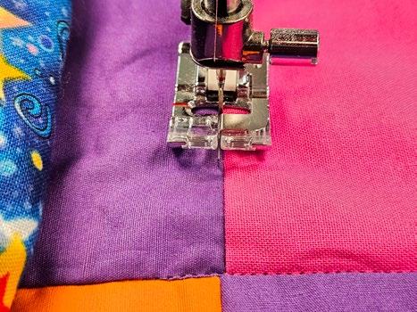Place the next piece of fabric face down. This step would be impossible without using the Ghost Mode to show me where to position it. The following Color Block will stitch it in place. Flip the fabric so the right side shows, and the next color block will secure it.