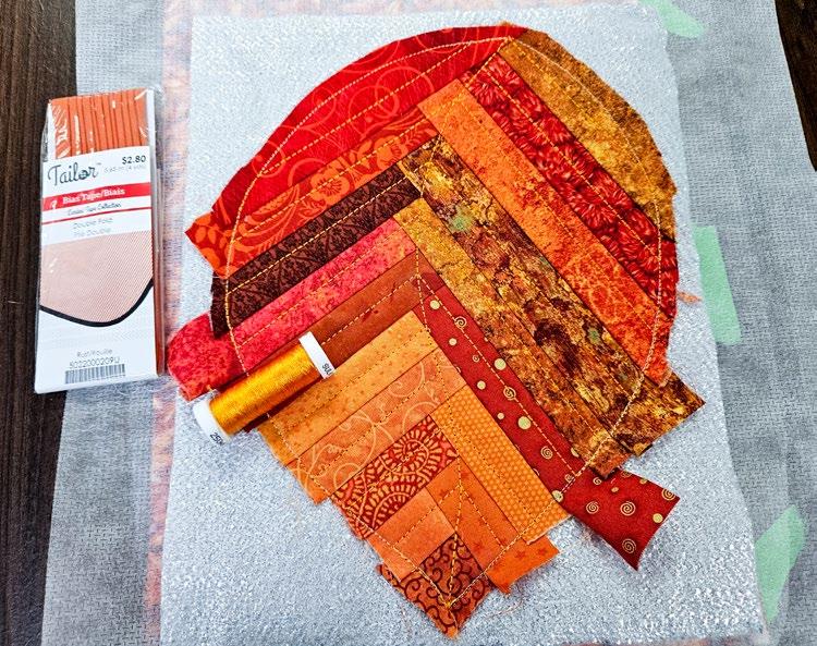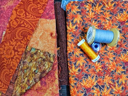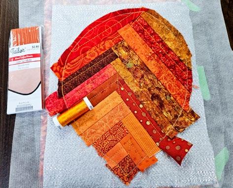 I went to my scrap box to find some orange scraps. The hot mat is a leaf shape; these colors remind me of fall. I need some 50wt thread for piecing and 40wt embroidery thread for the final stitching.