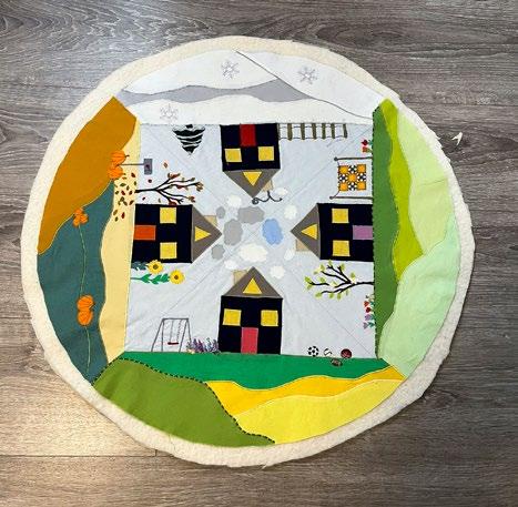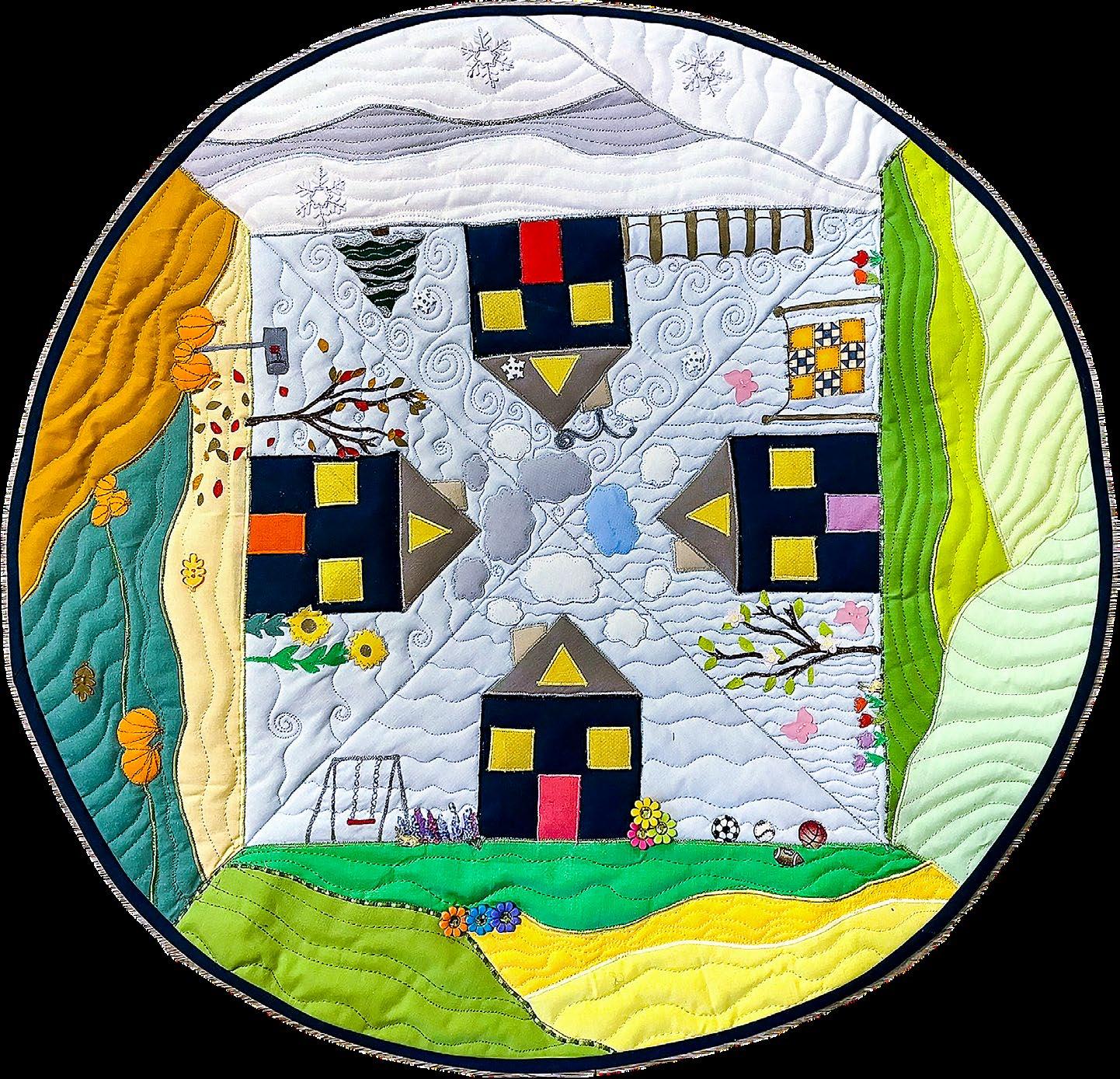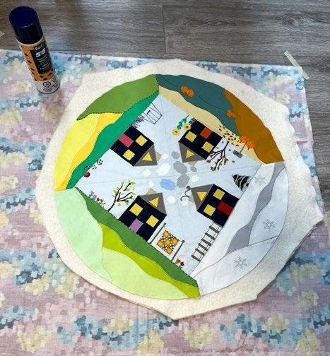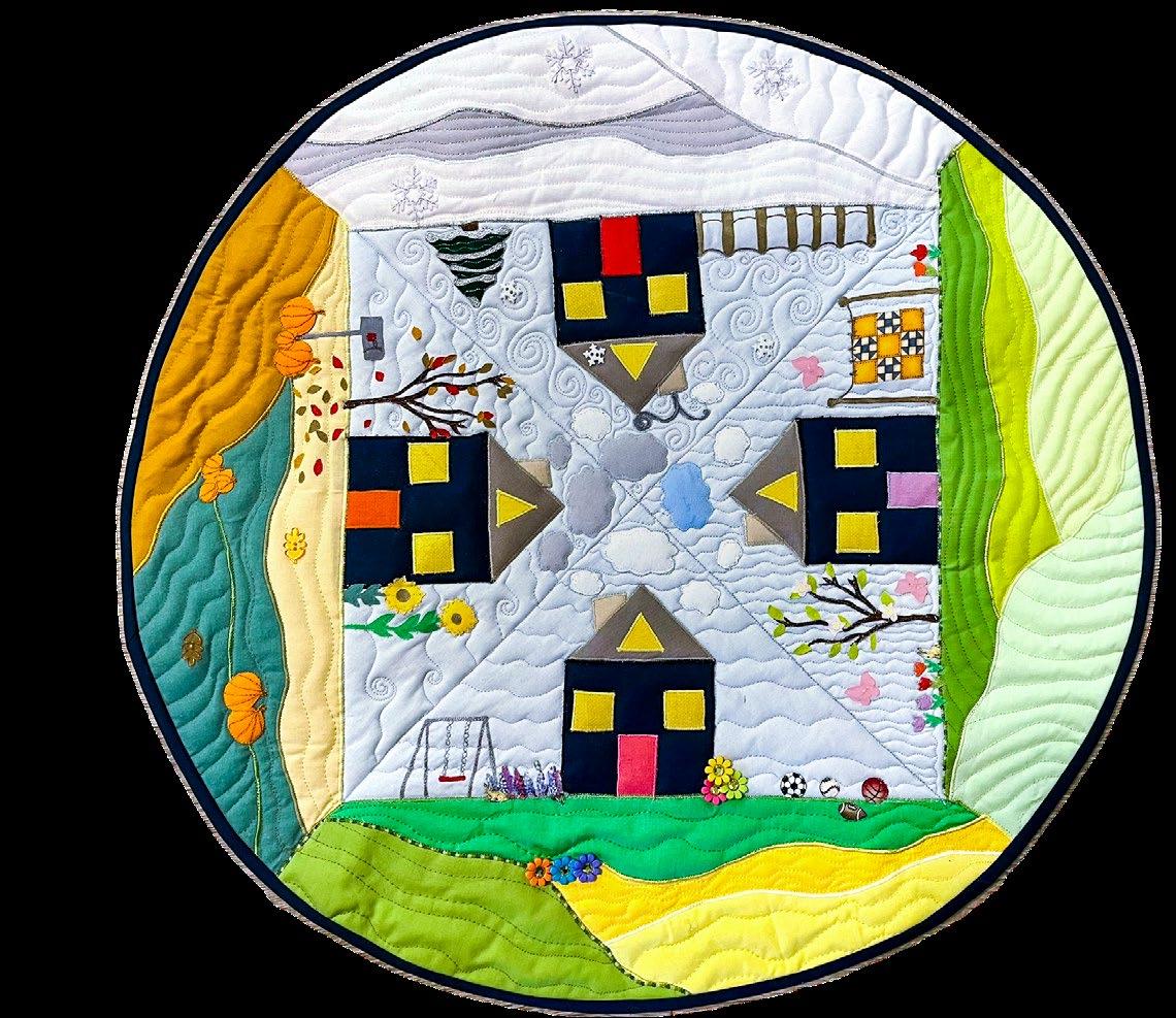 One way to brighten any space in your home is by making this bright Circle the Seasons Table Topper ! Let me show you how. It’s an applique project and oh-so-easy with the HeatnBond Lite family of products. It includes scenes of winter, spring, summer and fall. This topper is made very dimensional with Fairfeld Quilter’s 80/20 Quilt Batting, some lovely Dress It Up buttons, GÜTERMANN Invisible Nylon Thread and other decorative notions. This topper is 26” in diameter and will fit on any shaped table.