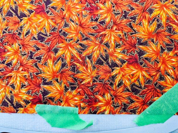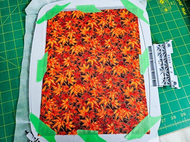 This particular design is a project-in-the-hoop. The next color block will secure a backing fabric, and the final step will be quilting. I use painter’s tape to secure the backing to the back side of the hoop. Ensure the tape is well secured, or it’ll roll up on the embroidery unit.
