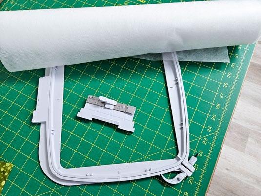 Let’s get our stabilizer hooped, so we’re ready to go. The Whisper Web Mesh (cut-a- way stabilizer) makes the perfect base for building the project sections in the hoop. It’ll remain in the project. I’ve also attached the hoop adapter to the hoop.