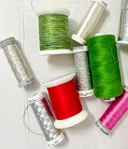 Featuring Aurifil thread from Italy. Long staple Egyptian cotton threads - 270 colours in 12, 28, 40 and 50 wt; 88 colours in 80 wt. Polyester Aurilux - 240 high sheen colours. Wool threads - 192 colours. Many kits available. Check our website!