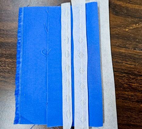 It’s time to add fabric. I’ll place the first piece as indicated on the Embroidery Stitchout screen. I’ve used a strip of fabric, which I’ll cut off in a minute. Ensure the piece is large enough to provide seam allowances.