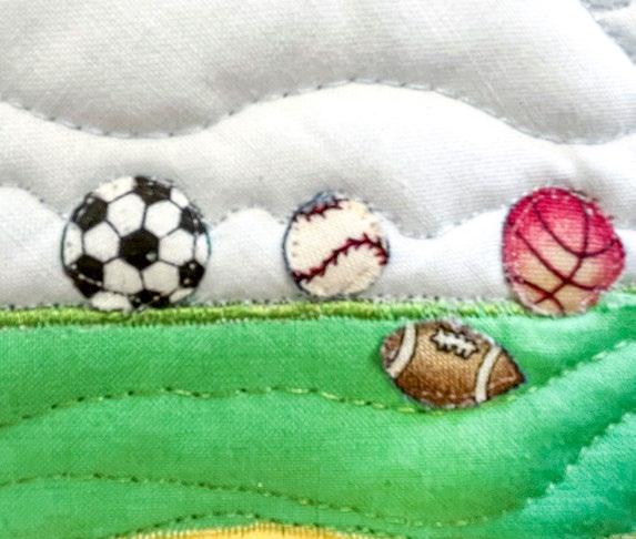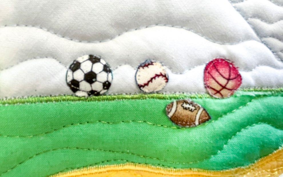 • scraps of fabric for applique (choose mostly solid colors and some novelty fabrics for sports balls, quilt, and flowers)