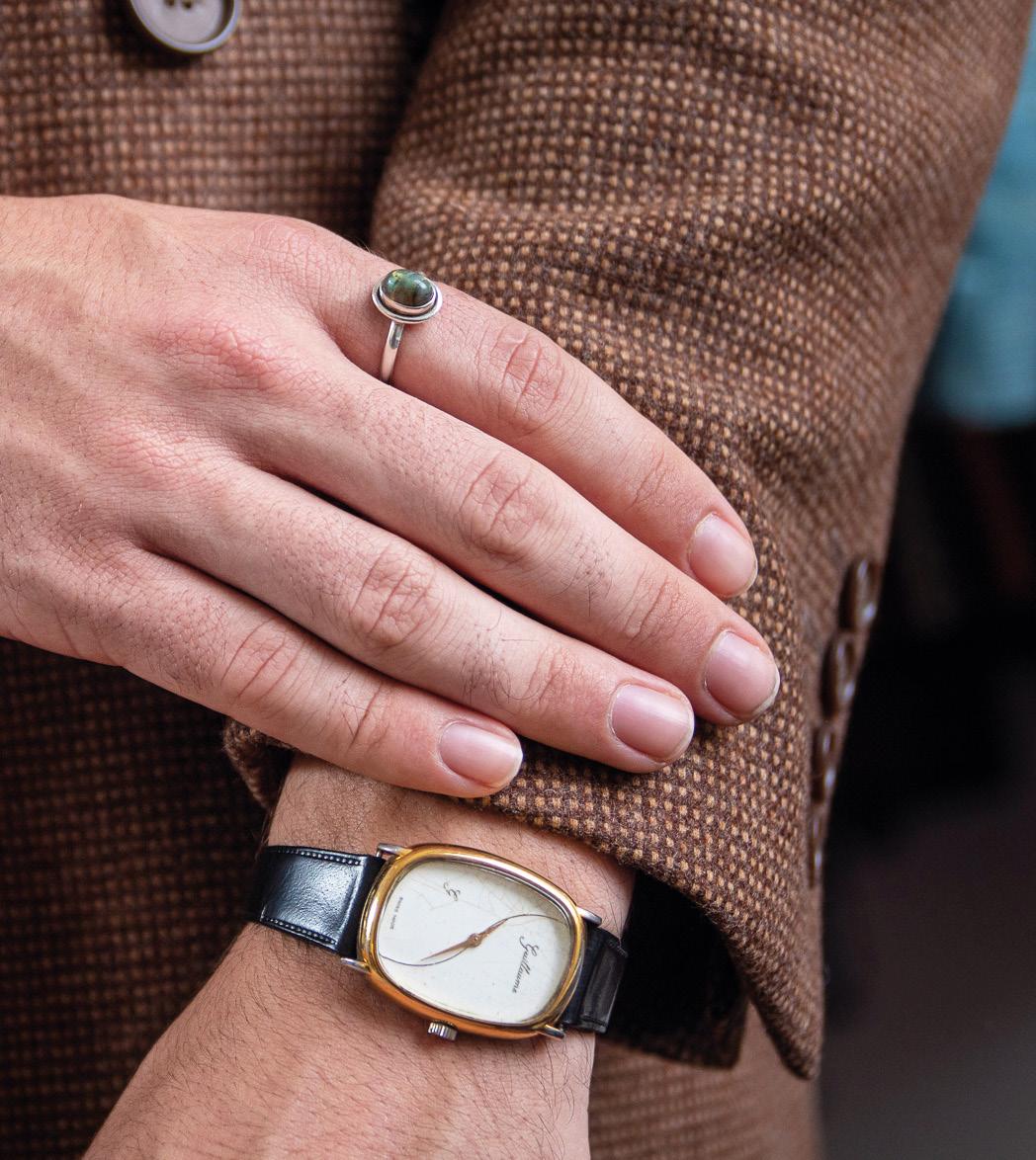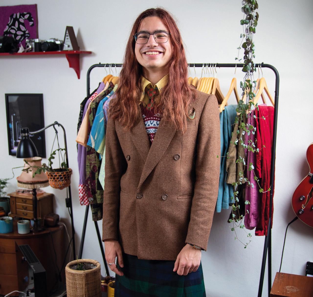 Hoe zou jij je stijl omschrijven? ‘Mijn stijl is vintage en doet denken aan de jaren zeventig en tachtig. Het bevat elementen van traditionele mannenkleding, zoals een stropdas en een jasje. Dit combineer ik graag met kleurrijke en vrouwelijke items. Zo draag ik nu een col bert met een kilt. Deze geruite wollen rok kreeg ik een jaar geleden cadeau van een Schotse kennis. Hij was ervan overtuigd dat het kledingstuk voor mij was gemaakt. Daarnaast draag ik oorbellen en lak ik mijn nagels.’