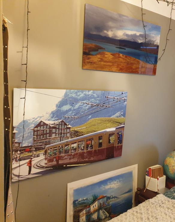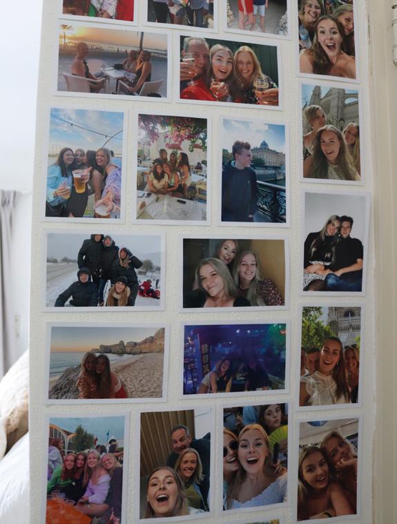 lacht ze. De licht blauw geverfde muren en de hoeveelheid rieten decoratie geven haar een sterk strandgevoel. ‘Het is alsof je in een hotel in Noordwijk zit’, zegt ze met een knip oog. ‘Misschien doet ze een hele drukke studie en wil ze graag in een rustig huis thuiskomen’, oppert ze. Mirthe probeert meer over de kamereigenaar te ontdekken, maar de rustige en anonieme uitstraling maakt haar zoektocht lastig. Op een paar foto’s na zijn er weinig persoonlijke spullen te vinden. Ook studiemateriaal en studieboeken zijn nergens te be kennen. ‘Ik denk in eerste instantie aan iets sociaals’, redeneert ze zonder onderbouwing. ‘Misschien stu deert ze niet, is dat ook een optie?’ Pas als Mirthe de fotocollage ontdekt, die verstopt