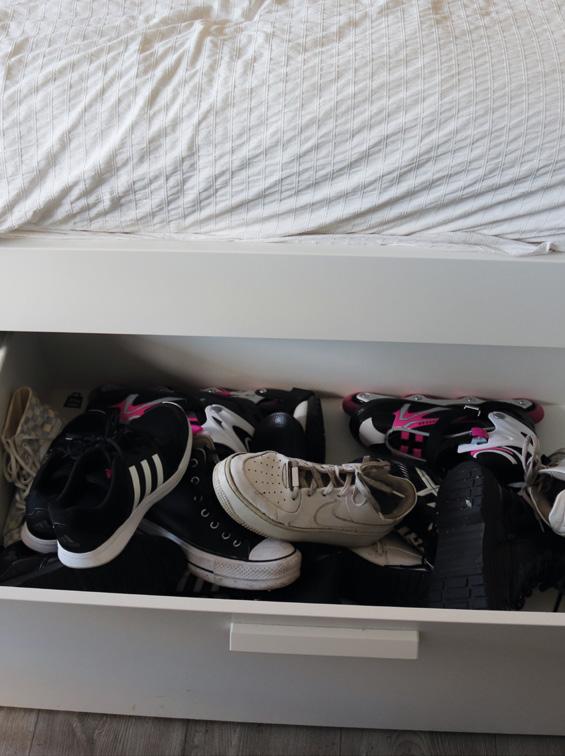In een poging de bewoner toch beter te leren ken nen, struint Mirthe nog een laatste keer door de ka mer. In een lade onder het bed vindt ze een paar skeelers tussen een uitgebreide schoenencollectie. Verstopt in een hoekje achter een kast staat het nog missende tennisracket. ‘Nu hebben we ook echt be wijs dat ze tennist’, concludeert ze. Daar stokt ech ter al snel het onderzoek. ‘Ik vind het moeilijk om te beoordelen wat voor een type persoon hier woont. Op basis van de foto op de muur zou ik zeggen dat ze rechten studeert’, zegt Mirthe peinzend. ‘De ka mer heeft een bepaalde stijl, het is een mooi geheel en het past goed bij elkaar. Ik kan me alleen geen specifiek karakter bij de persoon achter de kamer voorstellen.’