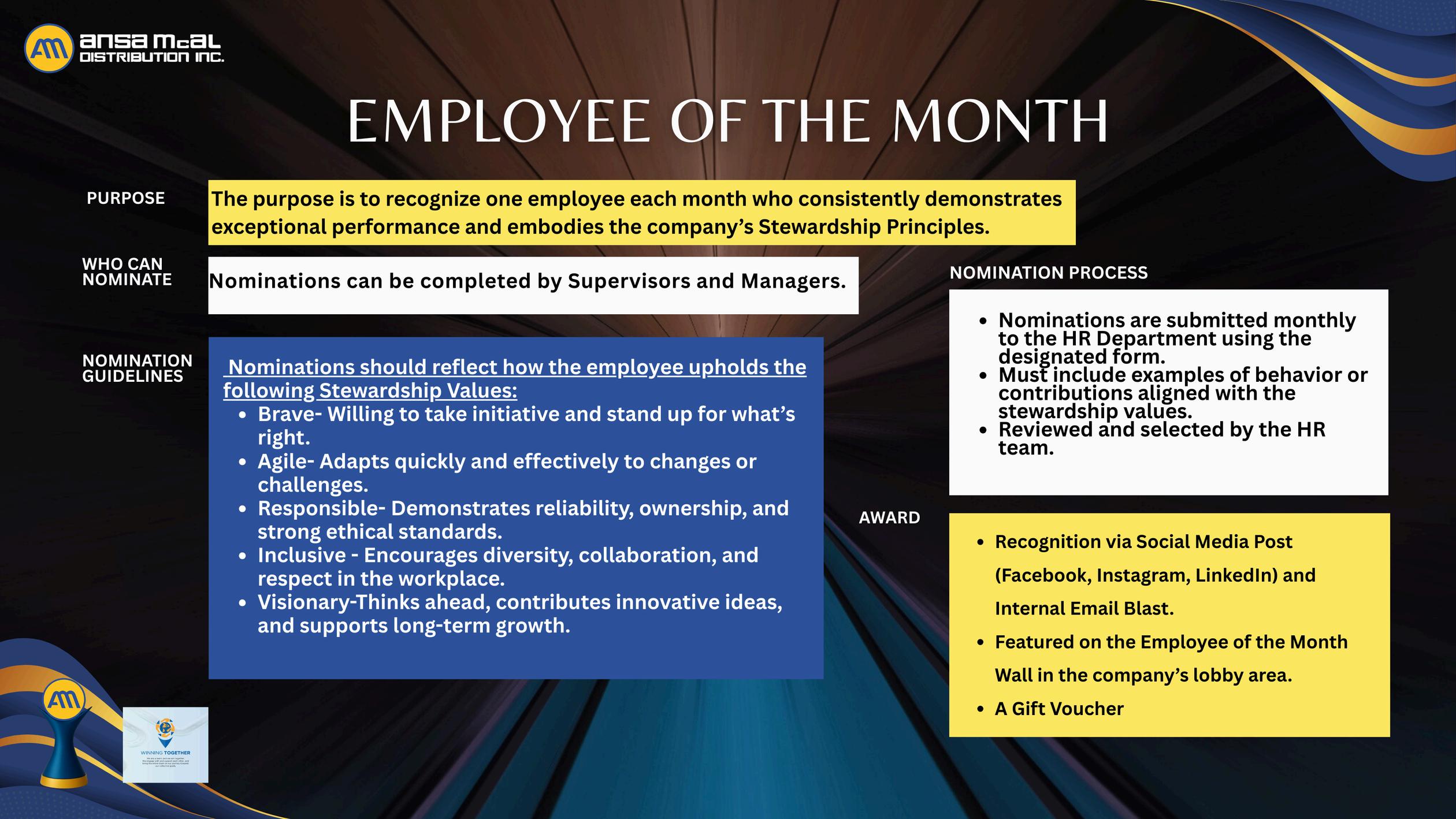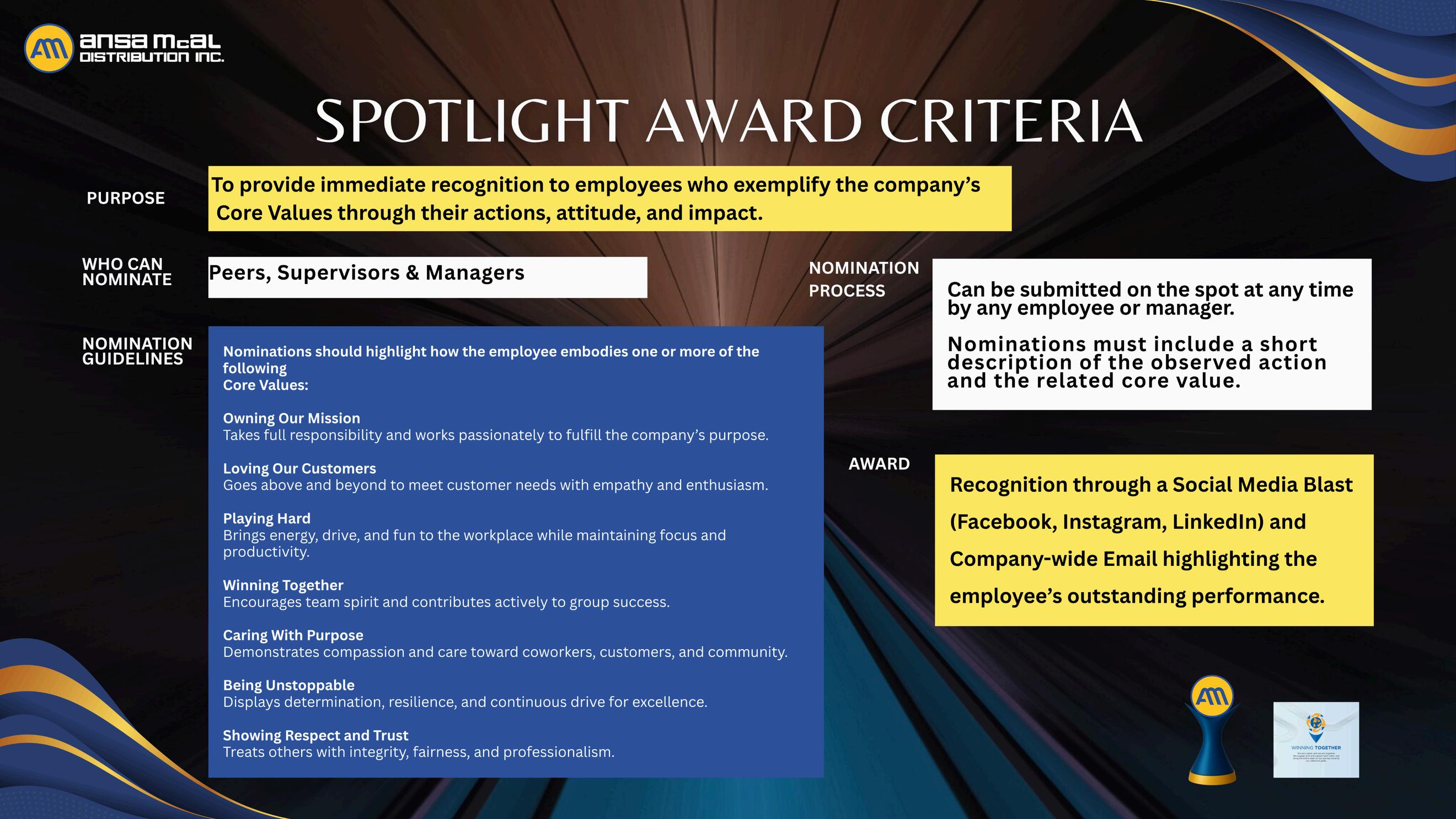 The AMDI Spotlight Award was established to honor employees for their hard work and commitment. This recognition occurs in two parts: employees can receive immediate acknowledgment for a specific task they've completed, or they may be selected as Employee of the Month by their supervisor or manager.