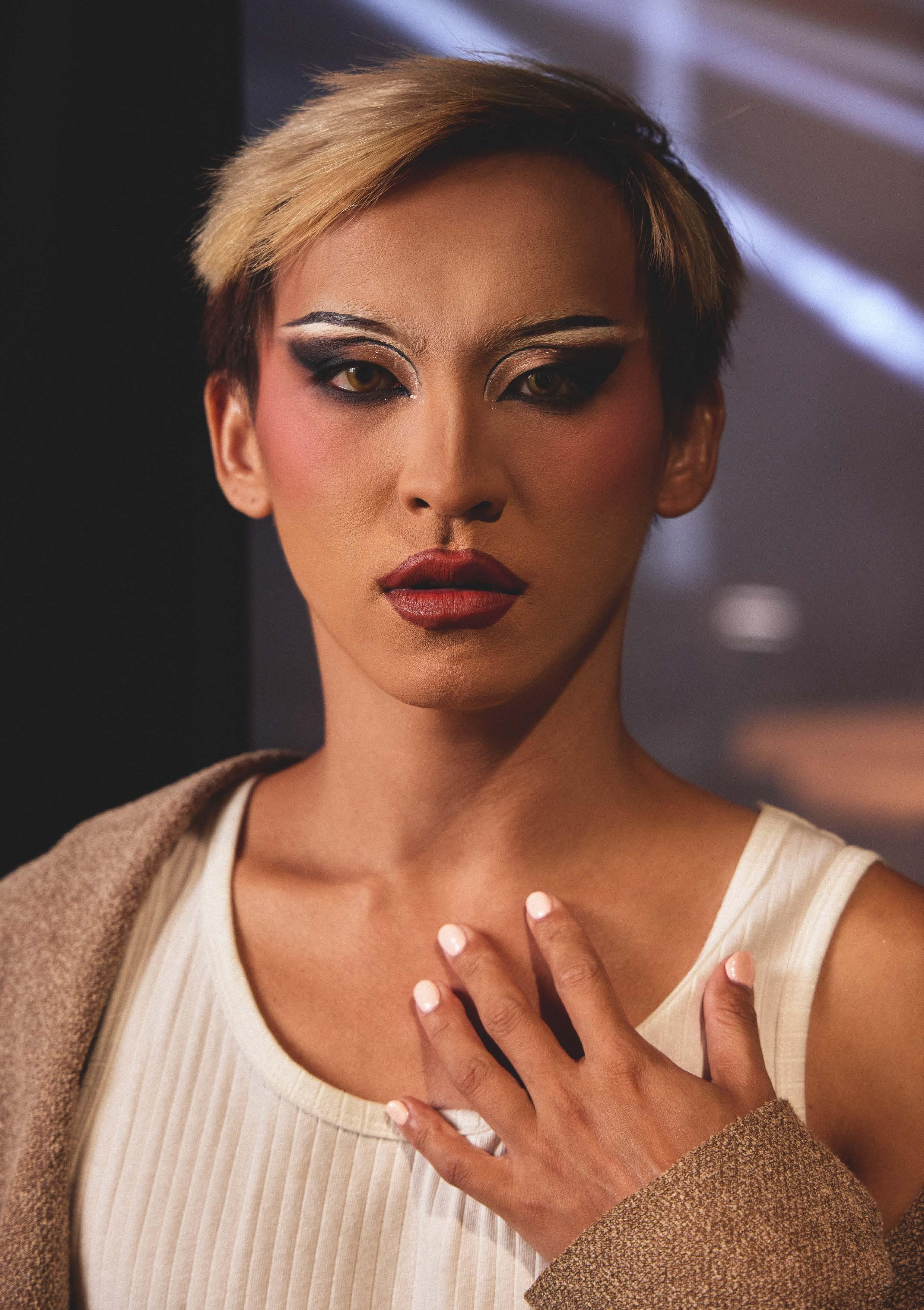 For her, drag is not escape but purpose. It is the courage to speak when others stay silent, to turn vulnerability into power. She feels a woman within, yet loves her body as it is. Her transformation is emotional, not physical, a dialogue between the man she is and the woman she imagines.
