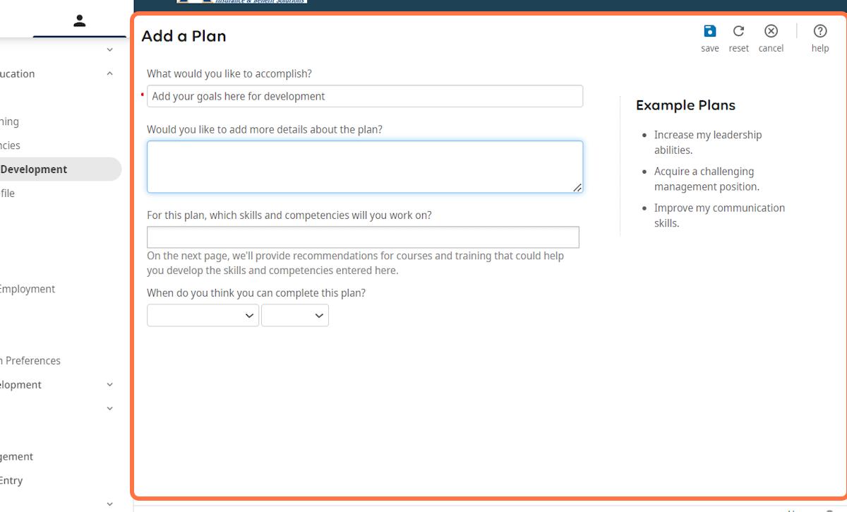 :nce in the personal development section, you can add a development goal by selecting" 0Add a Plan0