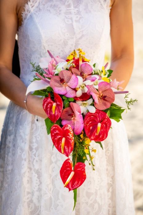 Tropical flowers include a colorful display of anthuriums (pinks, red or white), yellow oncidiums, orange birds of paradise, red or pink ginger lilies unless you specify a certain color scheme. Specific request may attract a surcharge.