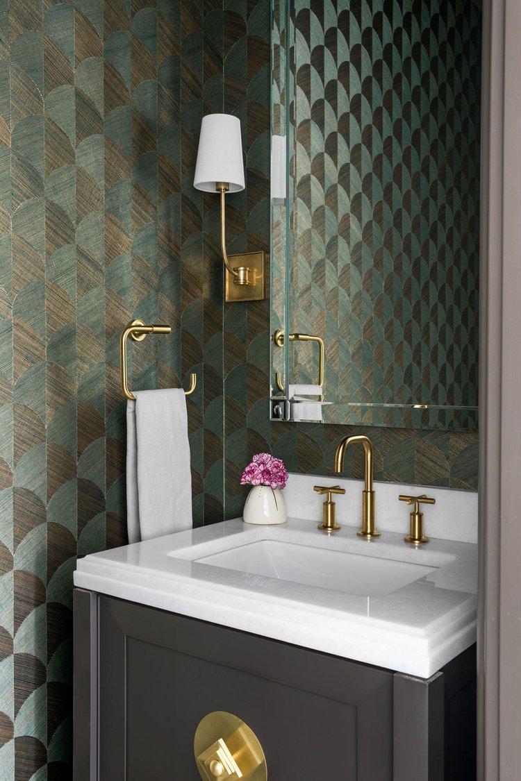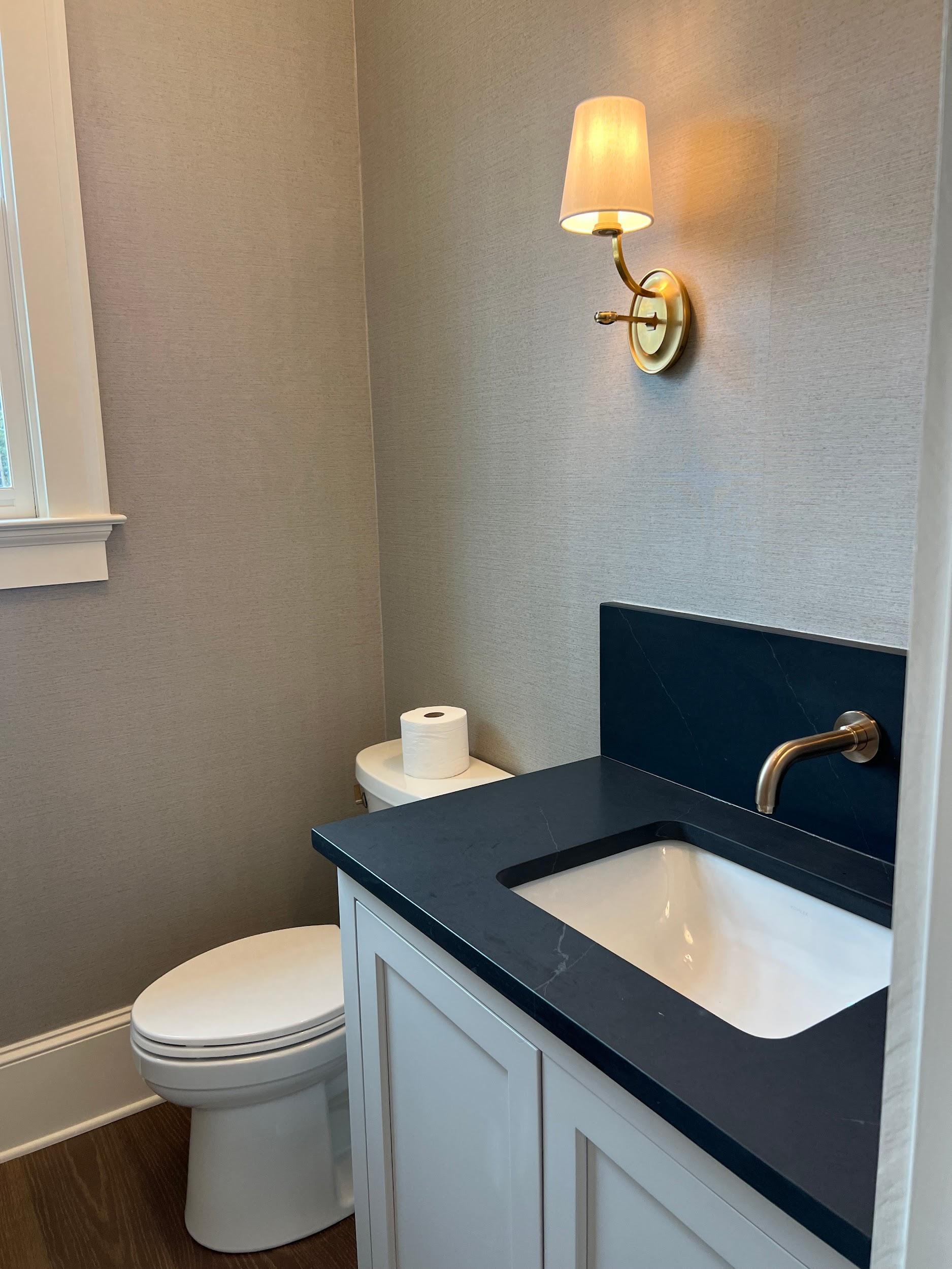 B. Simple but sophisticated vanity style painted a complimentary color to wallpaper