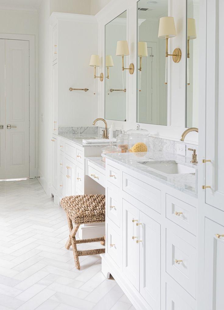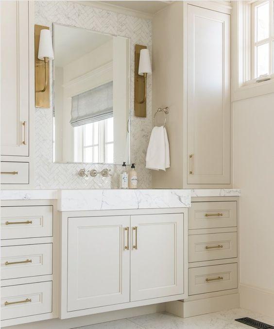 A. Bathroom vanities painted a sand color with brass sconces on either side of mirror