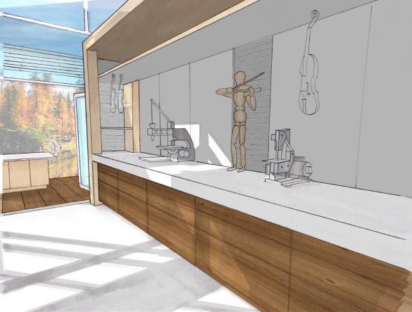 Central workstation with guest seating allows the luthier to enjoy company or provide demonstrations.
