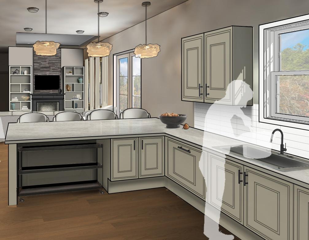 The design for the Williams residence is inspired and informed by the concept of ease. Successfully designing a home that accommodates aging in place is largely dependent on planning for the possibility of future ailments. The design uses both curvilinear and linear lines to reflect the concept of ease by creating visual interest and gradual movement throughout the interior. Contrast between light and dark materials and colors assists with depth perception and delineation of elements. The Williams residence successfully fosters feelings of comfort, tranquility, and ease, providing the clients with components that make aging in place easy and convenient.